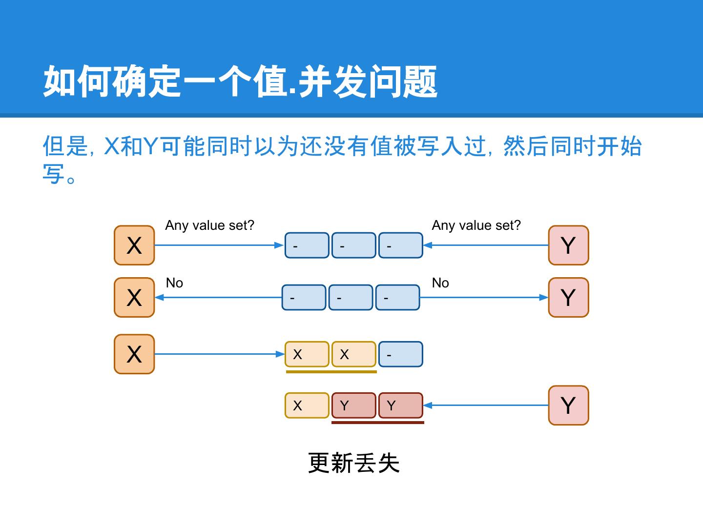 20 .如何确定一个值.并发问题 但是,X和Y可能同时以为还没有值被写入过,然后同时开始 写。 Any value set? Any value set? X - - - Y No No X - - - Y X X X - X Y Y Y 更新丢失