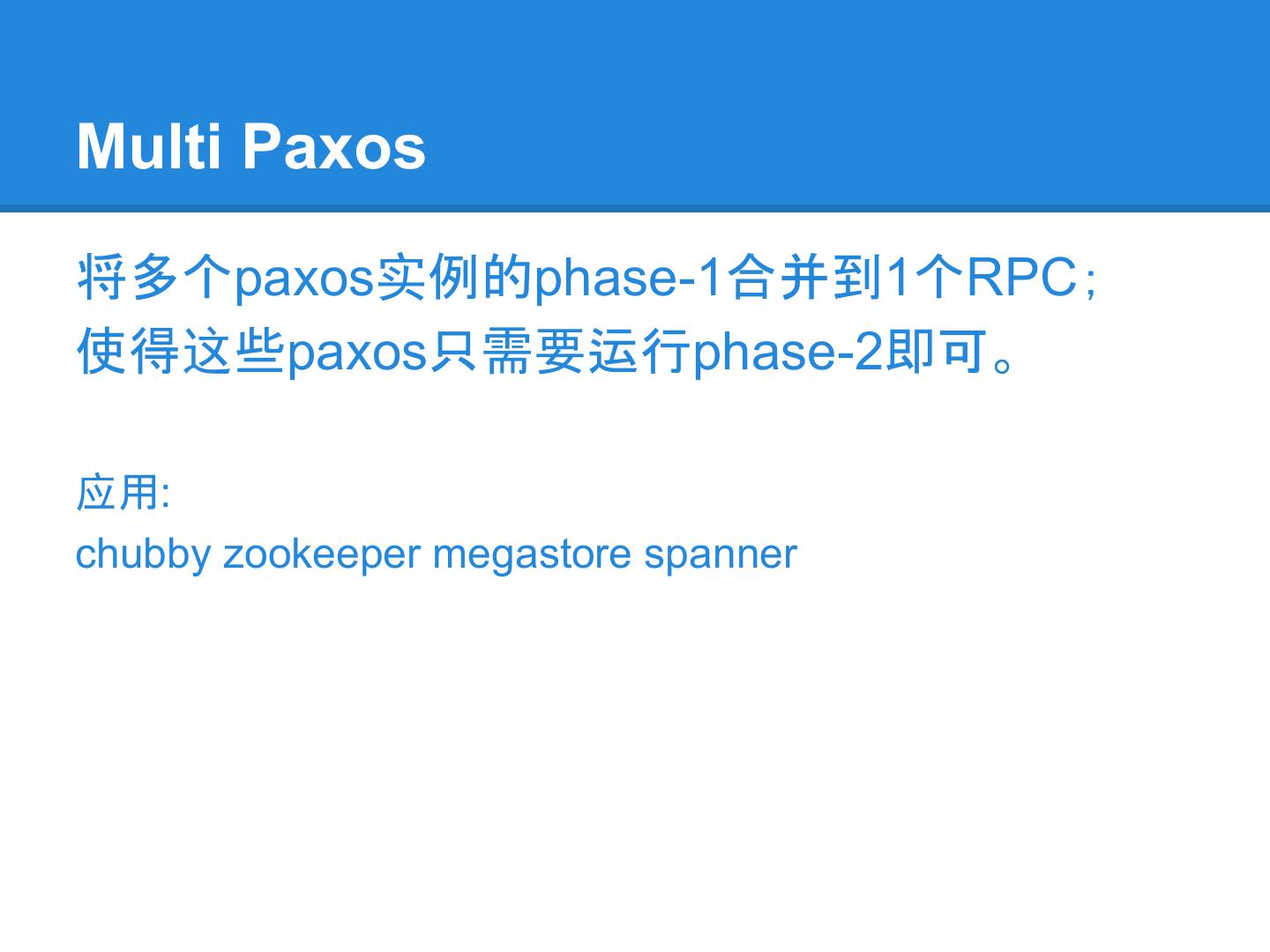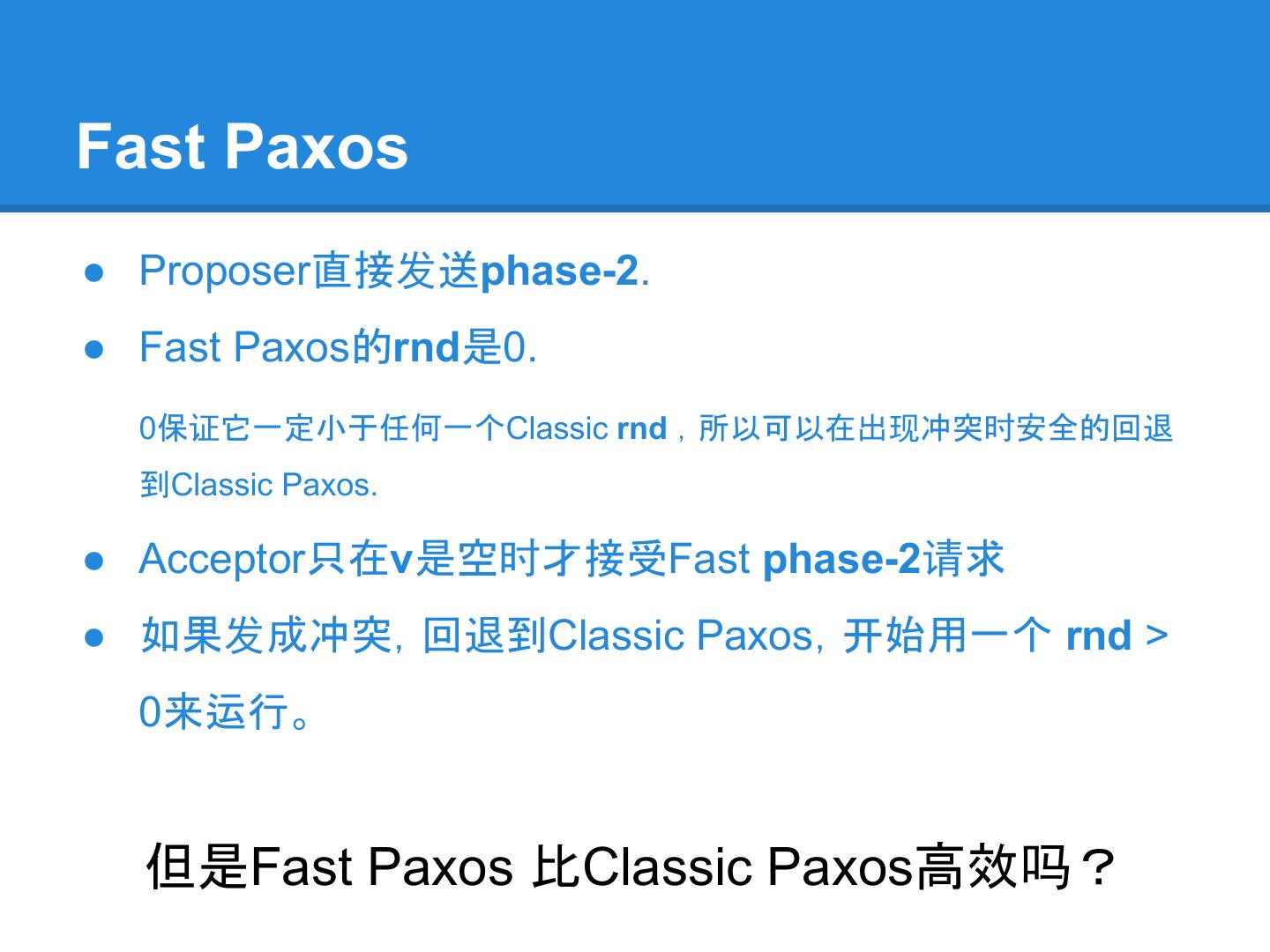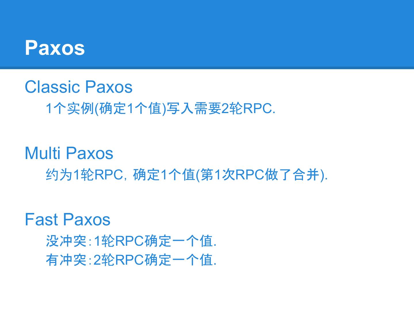 25 .Paxos Classic Paxos 1个实例(确定1个值)写入需要2轮RPC. Multi Paxos 约为1轮RPC,确定1个值(第1次RPC做了合并). Fast Paxos 没冲突:1轮RPC确定一个值. 有冲突:2轮RPC确定一个值.