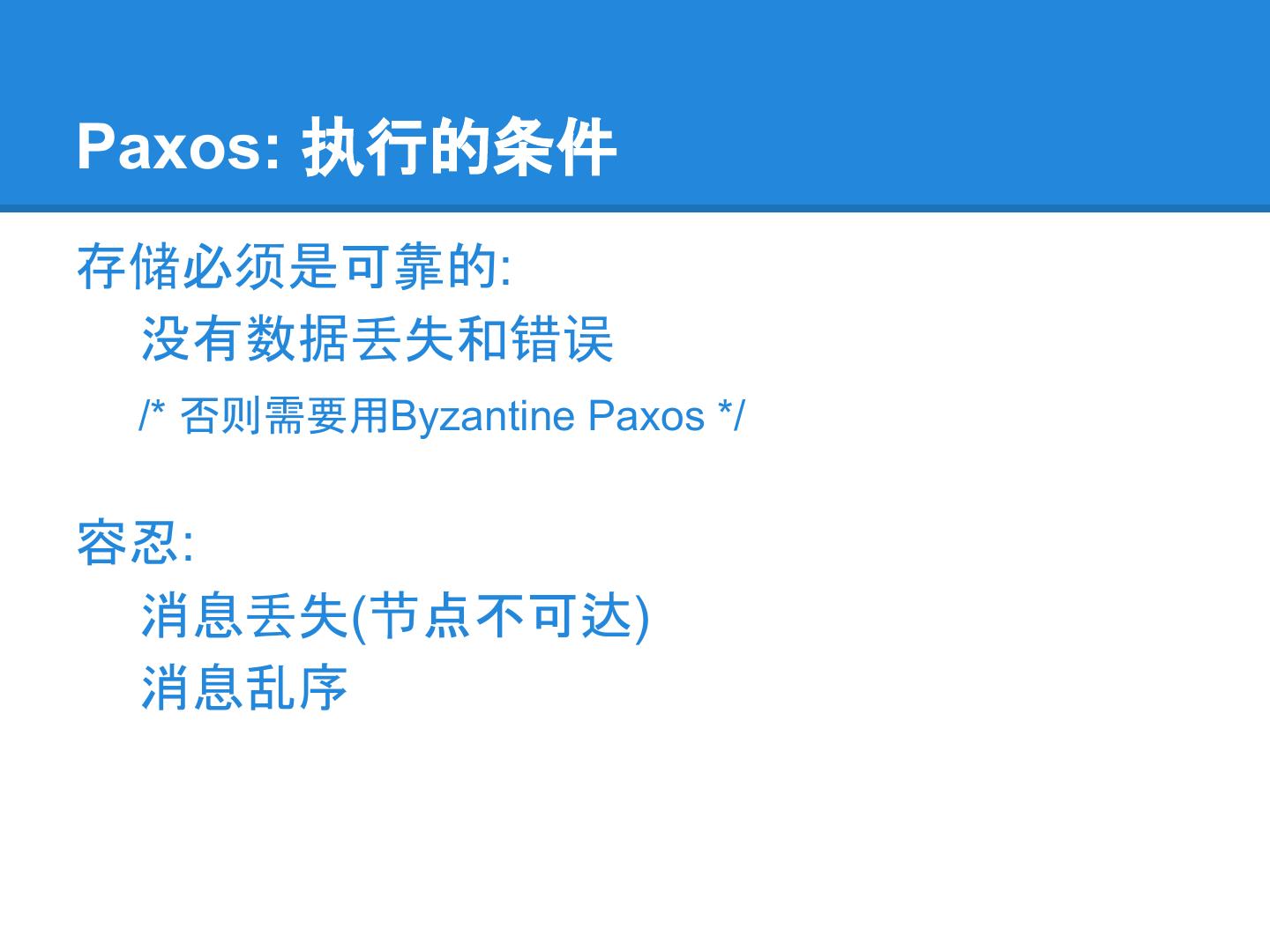 26 .Paxos: 执行的条件 存储必须是可靠的: 没有数据丢失和错误 /* 否则需要用Byzantine Paxos */ 容忍: 消息丢失(节点不可达) 消息乱序
