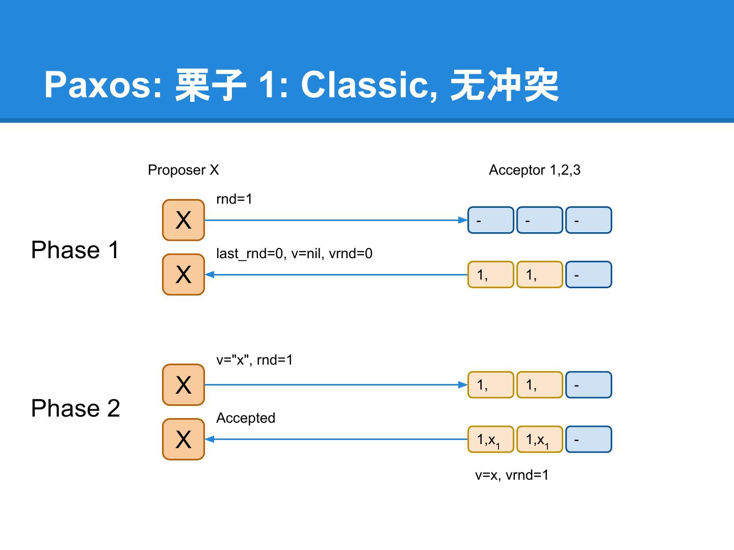 29 .Paxos: Classic - phase 1 Proposer X Acceptor 1,2,3 rnd=1 X - - - last_rnd=0, v=nil, vrnd=0 Phase 1 last_rnd=0, v=nil, vrnd=0.. X 1, 1, - 当Acceptor收到phase-1的请求时: ● 如果请求中rnd比Acceptor的last_rnd小,则拒绝请求 ● 将请求中的rnd保存到本地的last_rnd. 从此这个Acceptor只接受带有这个last_rnd的phase-2请求。 ● 返回应答,带上自己之前的last_rnd和之前已接受的v.