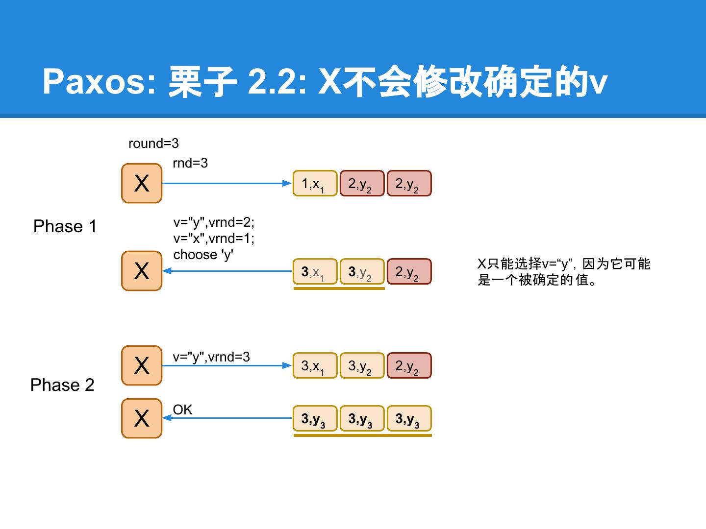 21 .如何确定一个值.. 方案改进:让存储节点记住谁最后1次做过“写前读取”,并拒 绝之前其他的“写前读取”的写入操作。 Any value set? X - - - No 现在节点1、2只接受X的写入 X - - - 多数派读的同时写入:X是最后读的。 Any value set? - - - Y No 现在节点2、3只接受Y的写入 - - - Y 多数派读的同时写入:Y是最后读的 X X - - X Y Y Y