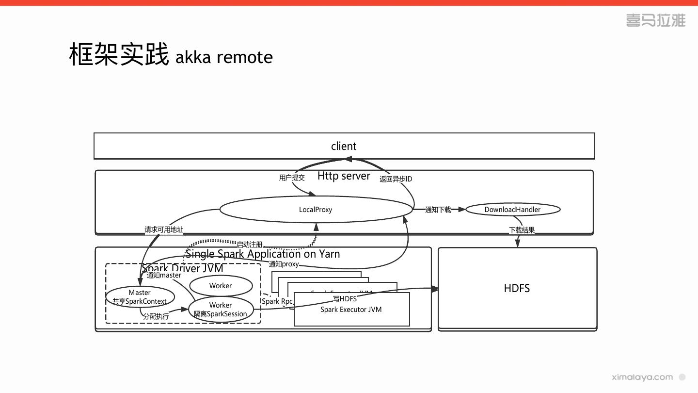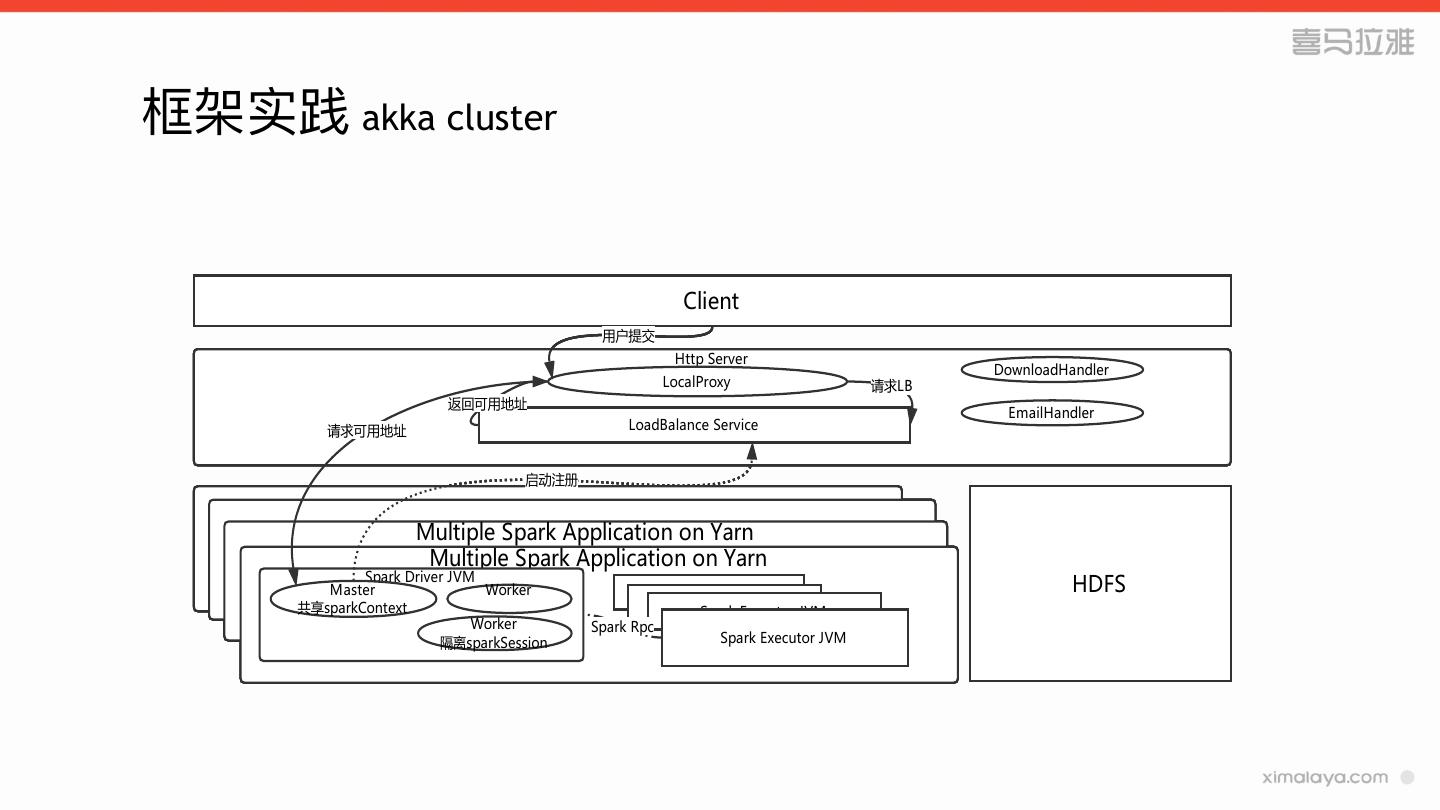 11 .框架实践 akka cluster Client 用户提交 Http Server DownloadHandler LocalProxy 请求LB 返回可用地址 返回可用地址 EmailHandler 请求可用地址 LoadBalance Service 启动注册 Multiple Spark Application on Yarn Multiple Spark Application on Yarn Spark Driver JVM Master Worker Spark Executor JVM HDFS 共享sparkContext Spark Executor JVM Spark Executor JVM Worker Spark Rpc 隔离sparkSession Spark Executor JVM