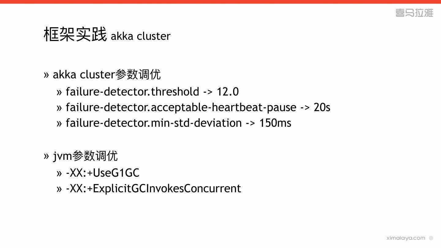 12 .框架实践 akka cluster » akka cluster参数调优 » failure-detector.threshold -> 12.0 » failure-detector.acceptable-heartbeat-pause -> 20s » failure-detector.min-std-deviation -> 150ms » jvm参数调优 » -XX:+UseG1GC » -XX:+ExplicitGCInvokesConcurrent
