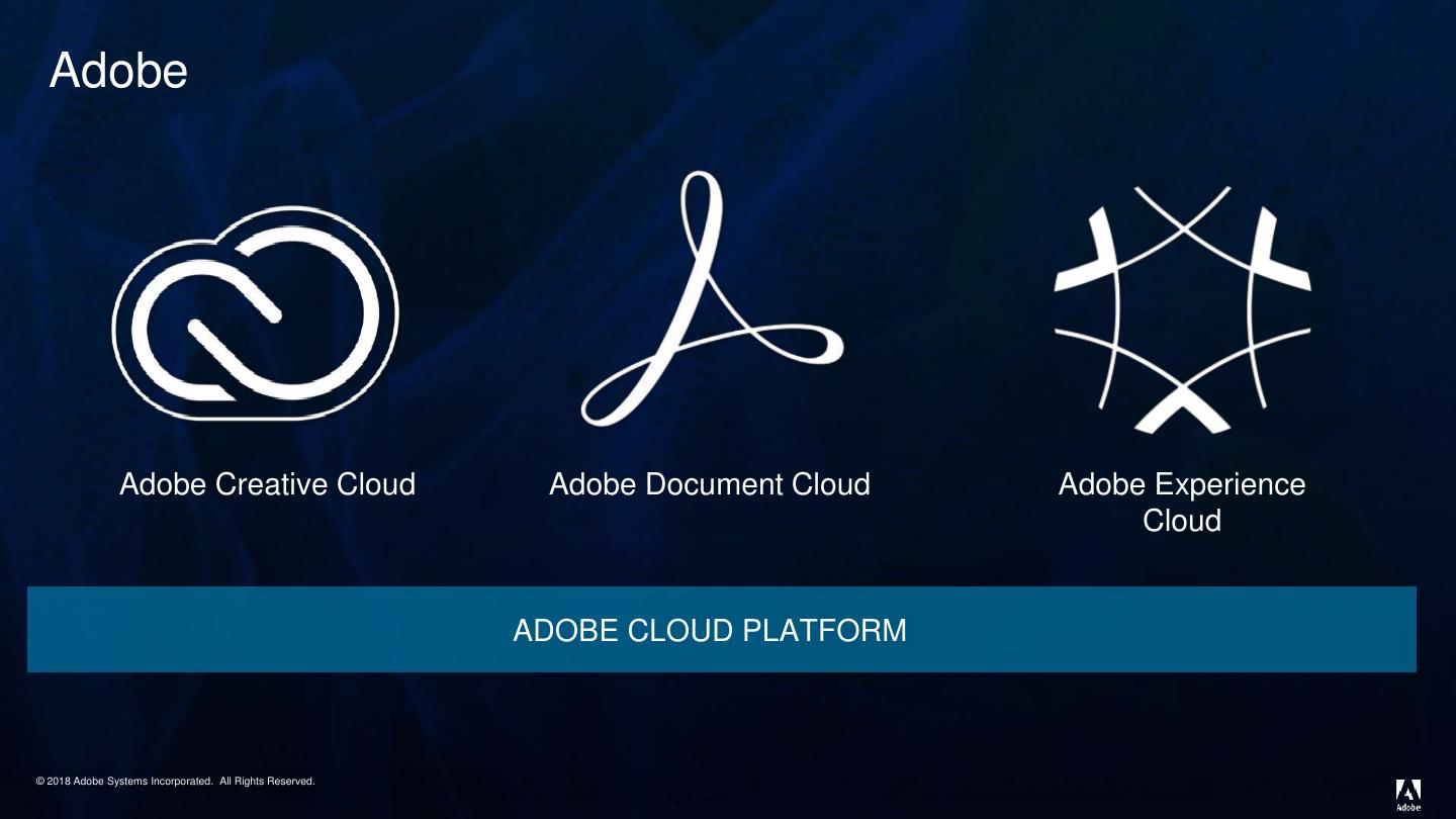 2 . Adobe Adobe Creative Cloud Adobe Document Cloud Adobe Experience Cloud ADOBE CLOUD PLATFORM © 2018 Adobe Systems Incorporated. All Rights Reserved.
