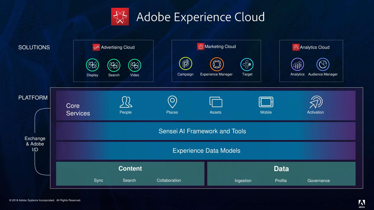 3 . SOLUTIONS Advertising Cloud Marketing Cloud Analytics Cloud Display Search Video Campaign Experience Manager Target Analytics Audience Manager PLATFORM Core Services People Places Assets Mobile Activation Sensei AI Framework and Tools Exchange & Adobe I/O Experience Data Models Content Data Sync Search Collaboration Ingestion Profile Governance © 2018 Adobe Systems Incorporated. All Rights Reserved.