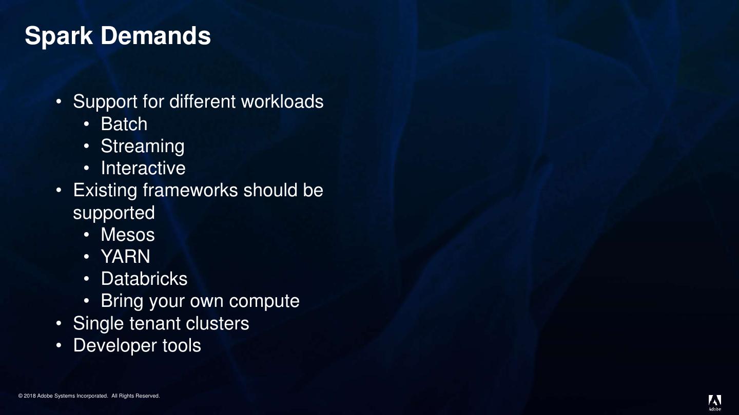 5 . Spark Demands • Support for different workloads • Batch • Streaming • Interactive • Existing frameworks should be supported • Mesos • YARN • Databricks • Bring your own compute • Single tenant clusters • Developer tools © 2018 Adobe Systems Incorporated. All Rights Reserved.
