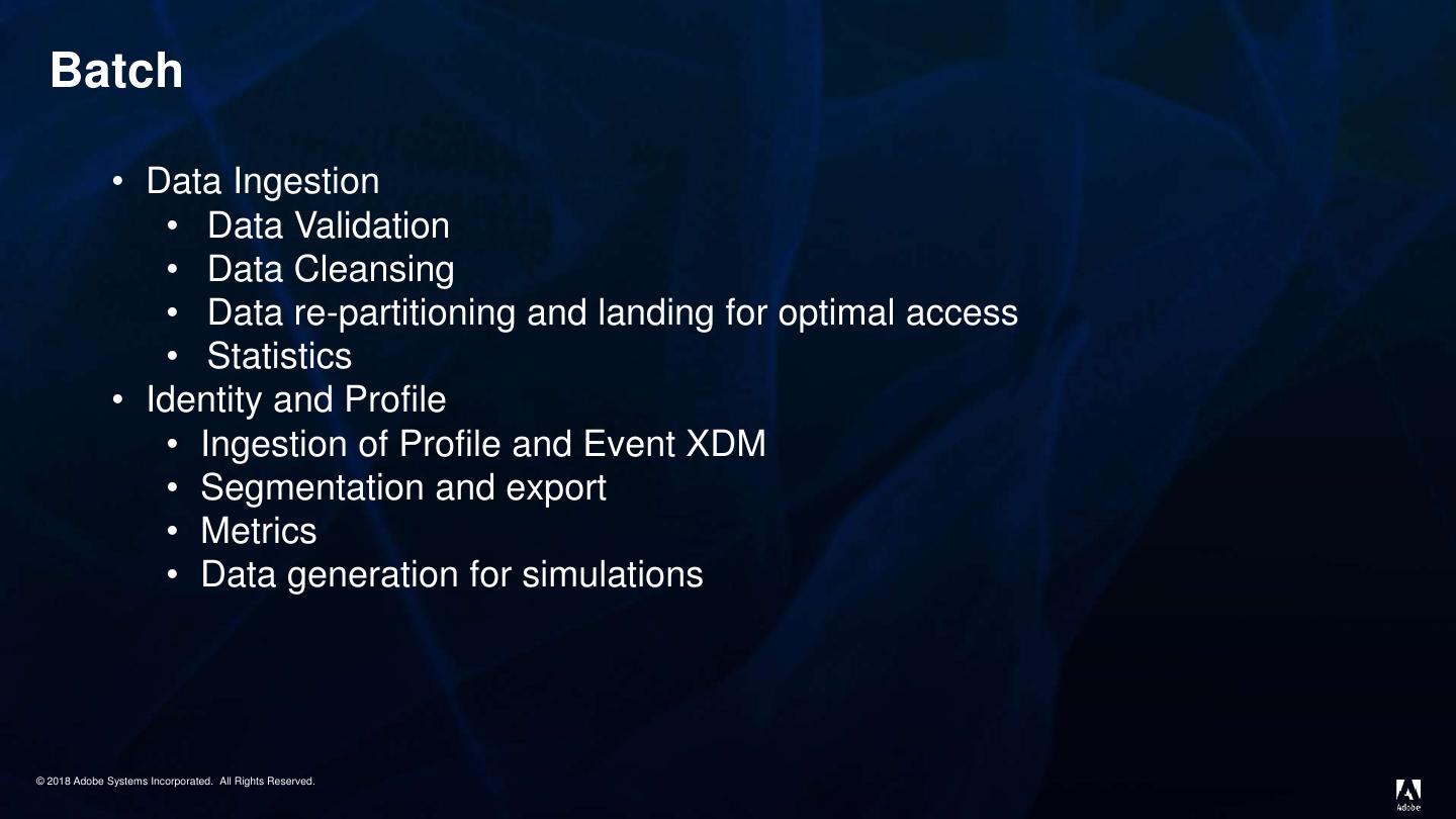 9 . Batch • Data Ingestion • Data Validation • Data Cleansing • Data re-partitioning and landing for optimal access • Statistics • Identity and Profile • Ingestion of Profile and Event XDM • Segmentation and export • Metrics • Data generation for simulations © 2018 Adobe Systems Incorporated. All Rights Reserved.