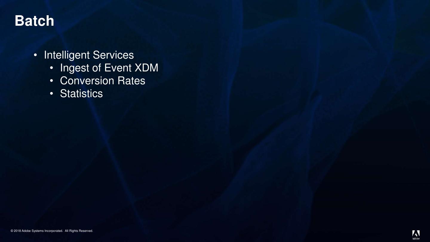 10 . Batch • Intelligent Services • Ingest of Event XDM • Conversion Rates • Statistics © 2018 Adobe Systems Incorporated. All Rights Reserved.