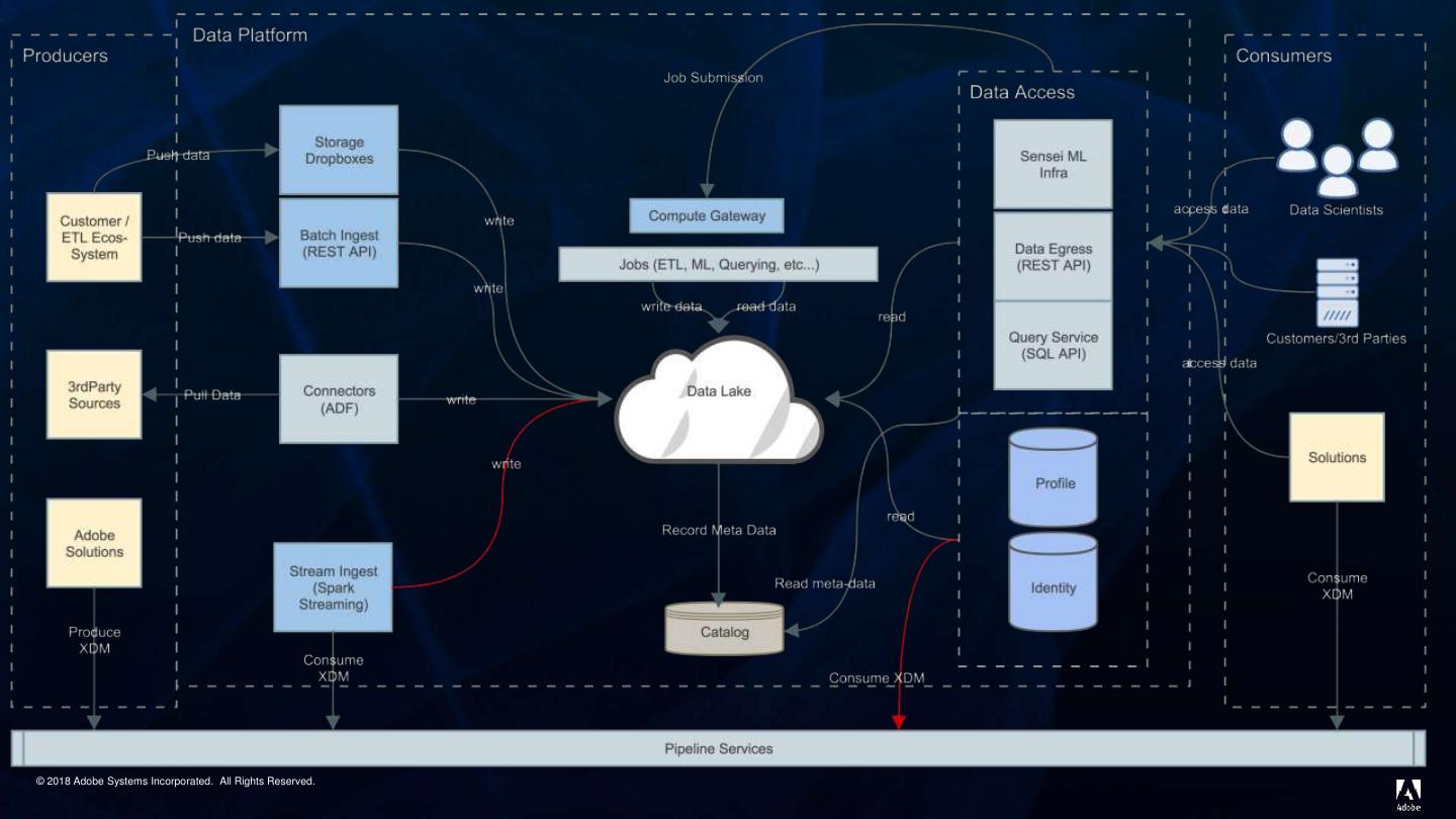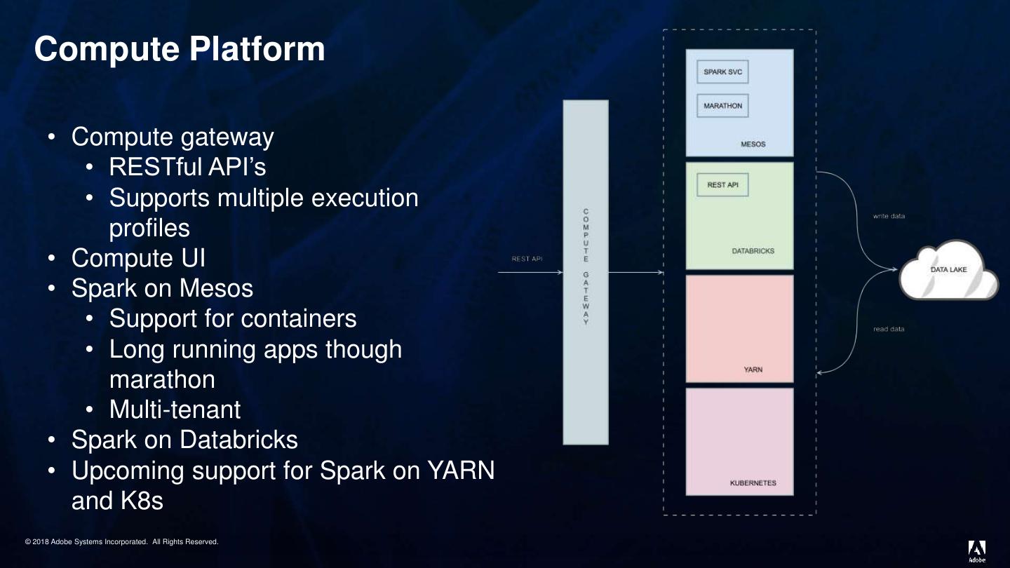15 . Compute Platform • Compute gateway • RESTful API’s • Supports multiple execution profiles • Compute UI • Spark on Mesos • Support for containers • Long running apps though marathon • Multi-tenant • Spark on Databricks • Upcoming support for Spark on YARN and K8s © 2018 Adobe Systems Incorporated. All Rights Reserved.