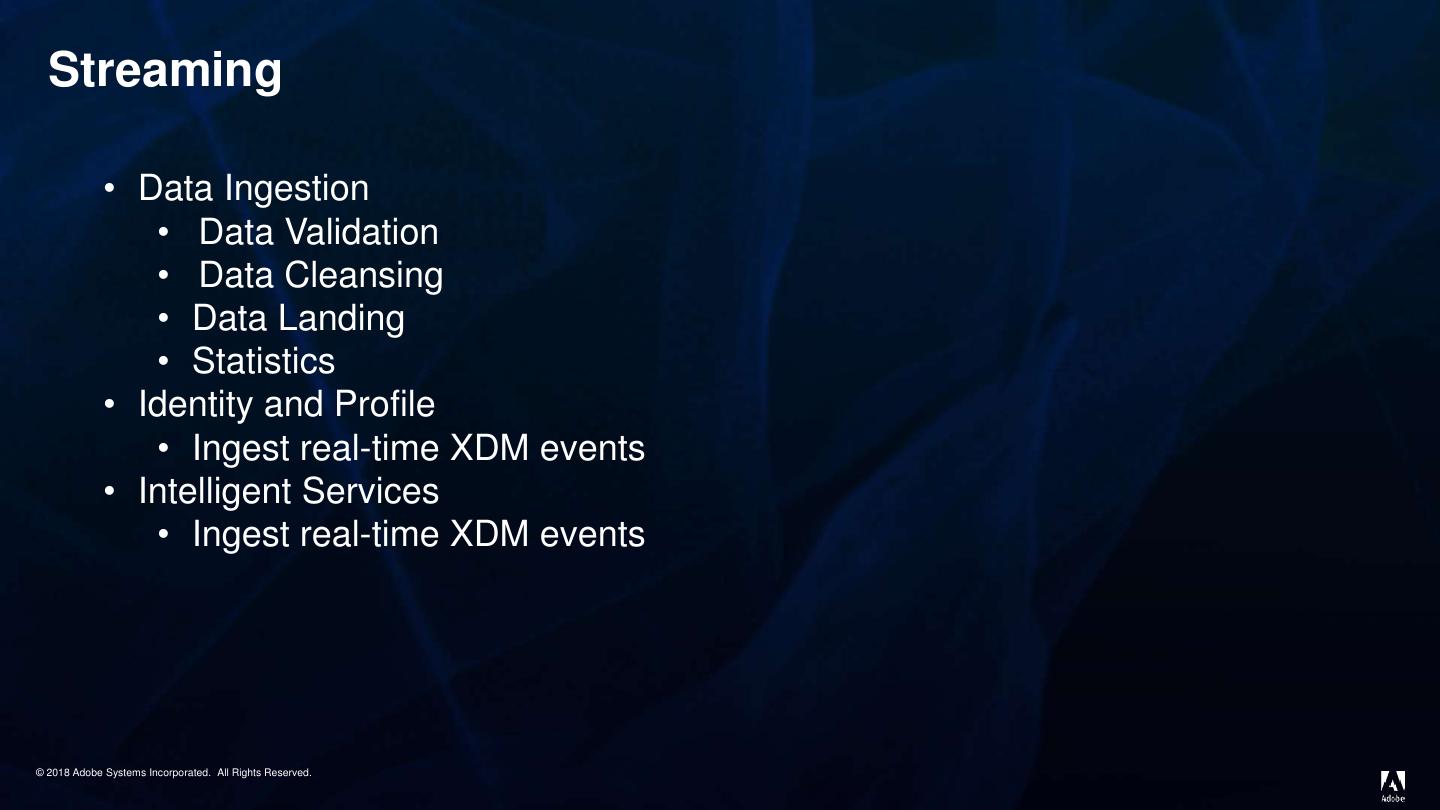 12 . Streaming • Data Ingestion • Data Validation • Data Cleansing • Data Landing • Statistics • Identity and Profile • Ingest real-time XDM events • Intelligent Services • Ingest real-time XDM events © 2018 Adobe Systems Incorporated. All Rights Reserved.