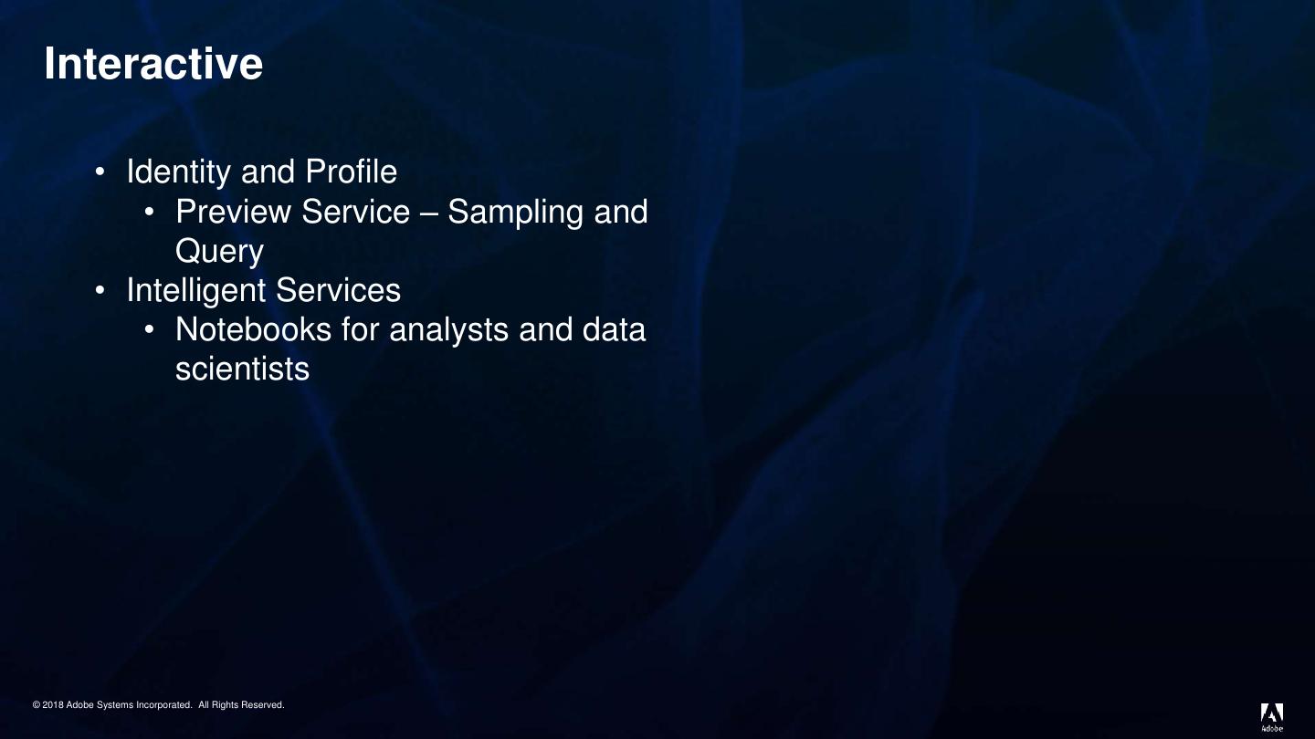 14 . Interactive • Identity and Profile • Preview Service – Sampling and Query • Intelligent Services • Notebooks for analysts and data scientists © 2018 Adobe Systems Incorporated. All Rights Reserved.