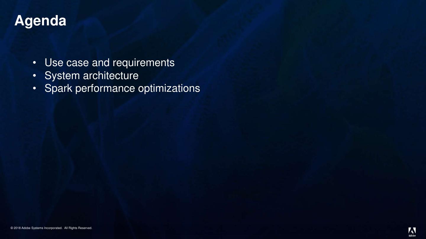 17 . Agenda • Use case and requirements • System architecture • Spark performance optimizations © 2018 Adobe Systems Incorporated. All Rights Reserved.