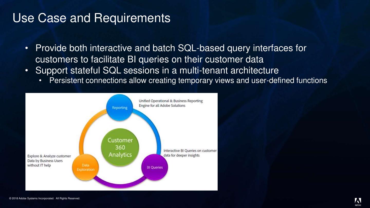 18 . Use Case and Requirements • Provide both interactive and batch SQL-based query interfaces for customers to facilitate BI queries on their customer data • Support stateful SQL sessions in a multi-tenant architecture • Persistent connections allow creating temporary views and user-defined functions © 2018 Adobe Systems Incorporated. All Rights Reserved.