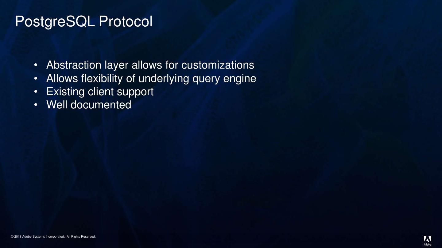 20 . PostgreSQL Protocol • Abstraction layer allows for customizations • Allows flexibility of underlying query engine • Existing client support • Well documented © 2018 Adobe Systems Incorporated. All Rights Reserved.