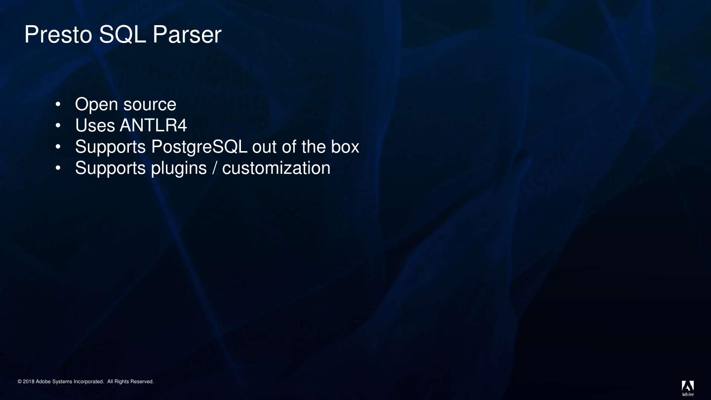 21 . Presto SQL Parser • Open source • Uses ANTLR4 • Supports PostgreSQL out of the box • Supports plugins / customization © 2018 Adobe Systems Incorporated. All Rights Reserved.