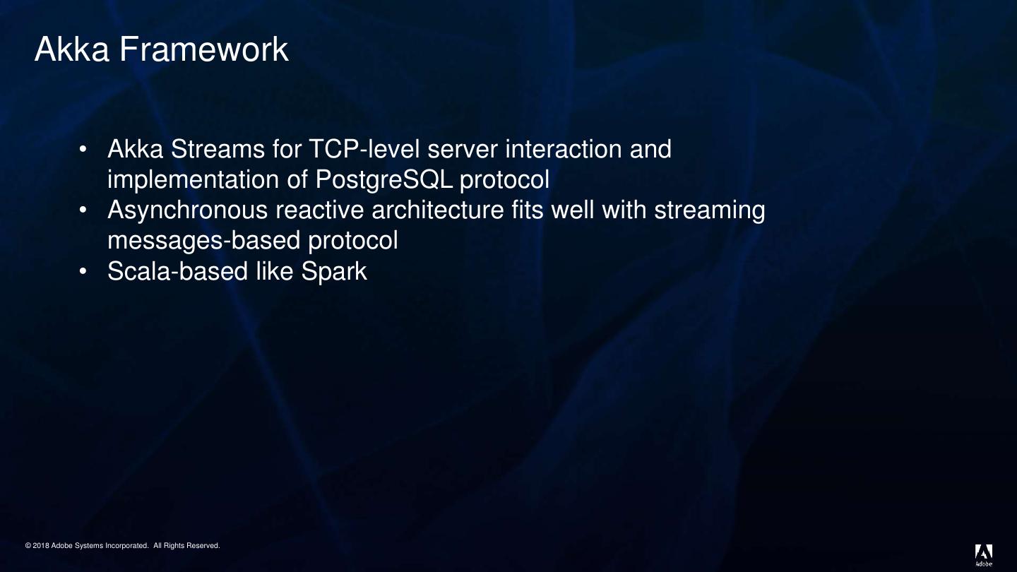 22 . Akka Framework • Akka Streams for TCP-level server interaction and implementation of PostgreSQL protocol • Asynchronous reactive architecture fits well with streaming messages-based protocol • Scala-based like Spark © 2018 Adobe Systems Incorporated. All Rights Reserved.