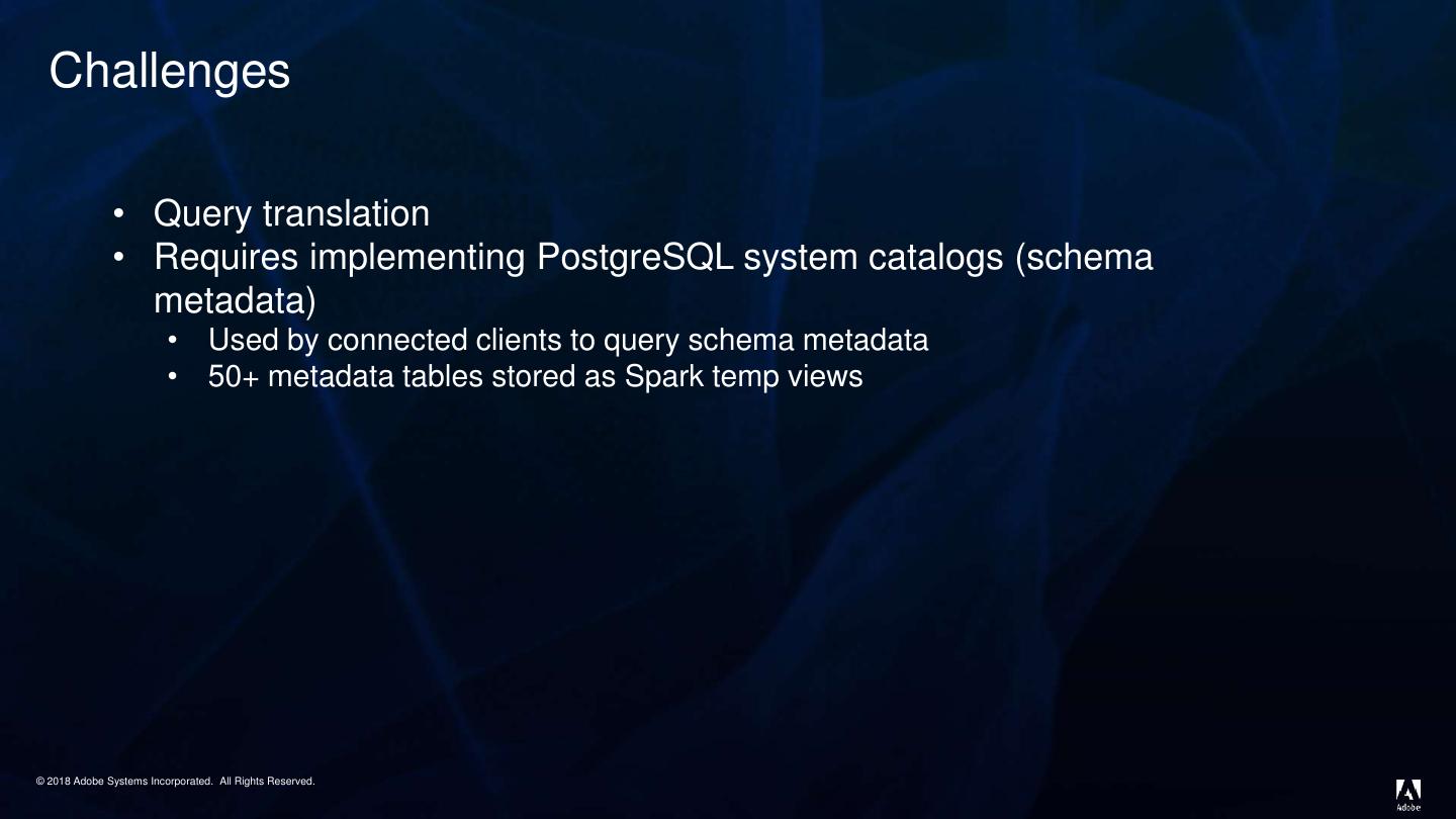 23 . Challenges • Query translation • Requires implementing PostgreSQL system catalogs (schema metadata) • Used by connected clients to query schema metadata • 50+ metadata tables stored as Spark temp views © 2018 Adobe Systems Incorporated. All Rights Reserved.