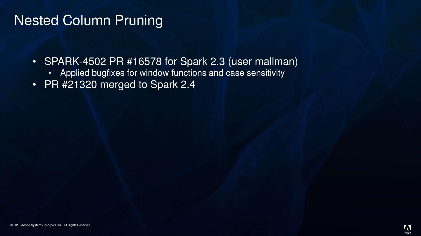 24 . Performance optimizations • Performance requirements • Up to 8-10 billion events/month per customer • Typical event schema can have thousands of columns with nested structures • Spark SQL 2.3 supports projection pruning on Parquet but not for nested columns © 2018 Adobe Systems Incorporated. All Rights Reserved.