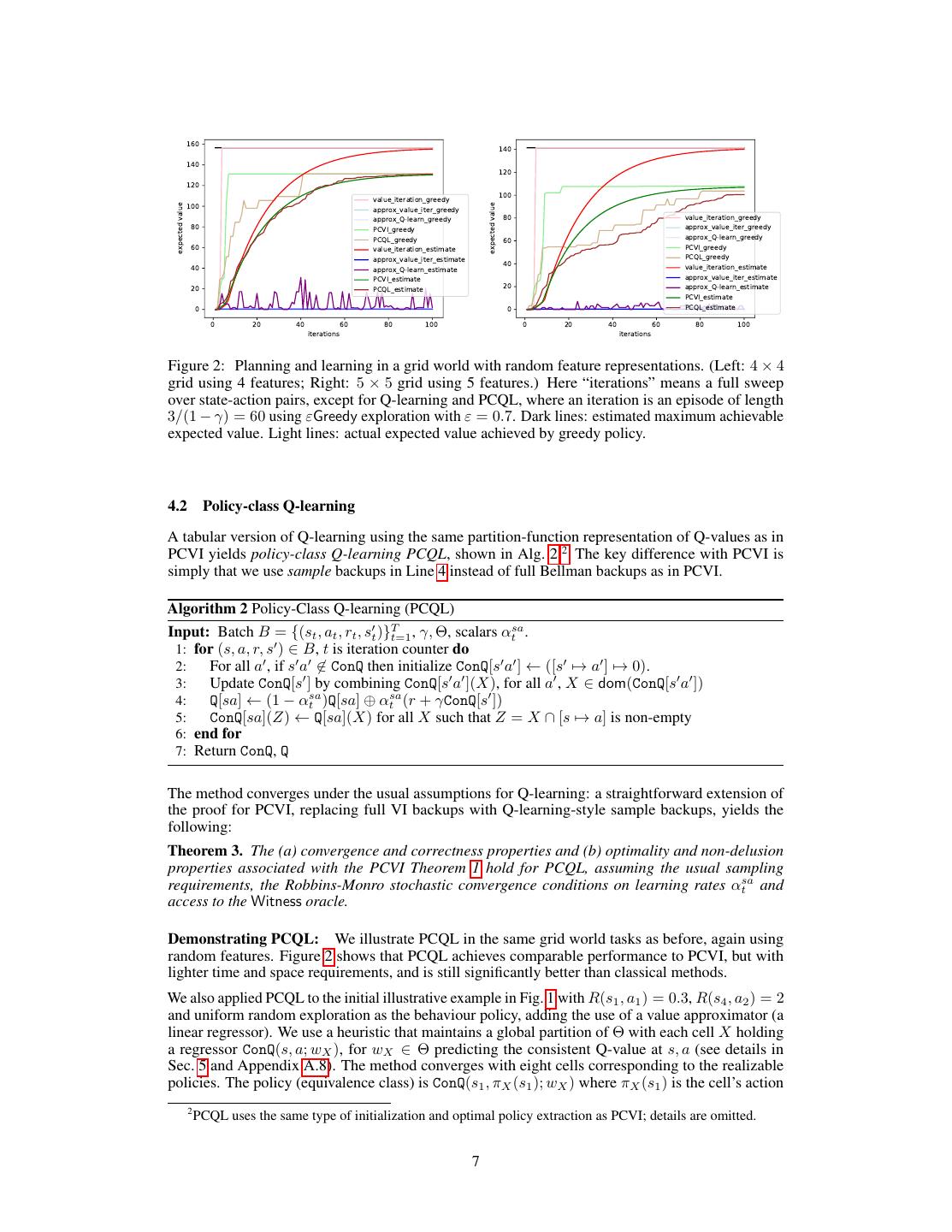 7 . 160 140 140 120 120 value_iteration_greedy 100 100 approx_value_iter_greedy expected value expected value approx_Q-learn_greedy 80 value_iteration_greedy 80 PCVI_greedy approx_value_iter_greedy PCQL_greedy 60 approx_Q-learn_greedy 60 value_iteration_estimate PCVI_greedy approx_value_iter_estimate PCQL_greedy 40 40 value_iteration_estimate approx_Q-learn_estimate PCVI_estimate approx_value_iter_estimate 20 PCQL_estimate 20 approx_Q-learn_estimate PCVI_estimate 0 0 PCQL_estimate 0 20 40 60 80 100 0 20 40 60 80 100 iterations iterations Figure 2: Planning and learning in a grid world with random feature representations. (Left: 4 × 4 grid using 4 features; Right: 5 × 5 grid using 5 features.) Here “iterations” means a full sweep over state-action pairs, except for Q-learning and PCQL, where an iteration is an episode of length 3/(1 − γ) = 60 using εGreedy exploration with ε = 0.7. Dark lines: estimated maximum achievable expected value. Light lines: actual expected value achieved by greedy policy. 4.2 Policy-class Q-learning A tabular version of Q-learning using the same partition-function representation of Q-values as in PCVI yields policy-class Q-learning PCQL, shown in Alg. 2.2 The key difference with PCVI is simply that we use sample backups in Line 4 instead of full Bellman backups as in PCVI. Algorithm 2 Policy-Class Q-learning (PCQL) Input: Batch B = {(st , at , rt , st )}Tt=1 , γ, Θ, scalars αtsa . 1: for (s, a, r, s ) ∈ B, t is iteration counter do 2: For all a , if s a ∈ ConQ then initialize ConQ[s a ] ← ([s → a ] → 0). 3: Update ConQ[s ] by combining ConQ[s a ](X), for all a , X ∈ dom(ConQ[s a ]) 4: Q[sa] ← (1 − αtsa )Q[sa] ⊕ αtsa (r + γConQ[s ]) 5: ConQ[sa](Z) ← Q[sa](X) for all X such that Z = X ∩ [s → a] is non-empty 6: end for 7: Return ConQ, Q The method converges under the usual assumptions for Q-learning: a straightforward extension of the proof for PCVI, replacing full VI backups with Q-learning-style sample backups, yields the following: Theorem 3. The (a) convergence and correctness properties and (b) optimality and non-delusion properties associated with the PCVI Theorem 1 hold for PCQL, assuming the usual sampling requirements, the Robbins-Monro stochastic convergence conditions on learning rates αtsa and access to the Witness oracle. Demonstrating PCQL: We illustrate PCQL in the same grid world tasks as before, again using random features. Figure 2 shows that PCQL achieves comparable performance to PCVI, but with lighter time and space requirements, and is still significantly better than classical methods. We also applied PCQL to the initial illustrative example in Fig. 1 with R(s1 , a1 ) = 0.3, R(s4 , a2 ) = 2 and uniform random exploration as the behaviour policy, adding the use of a value approximator (a linear regressor). We use a heuristic that maintains a global partition of Θ with each cell X holding a regressor ConQ(s, a; wX ), for wX ∈ Θ predicting the consistent Q-value at s, a (see details in Sec. 5 and Appendix A.8). The method converges with eight cells corresponding to the realizable policies. The policy (equivalence class) is ConQ(s1 , πX (s1 ); wX ) where πX (s1 ) is the cell’s action 2 PCQL uses the same type of initialization and optimal policy extraction as PCVI; details are omitted. 7
