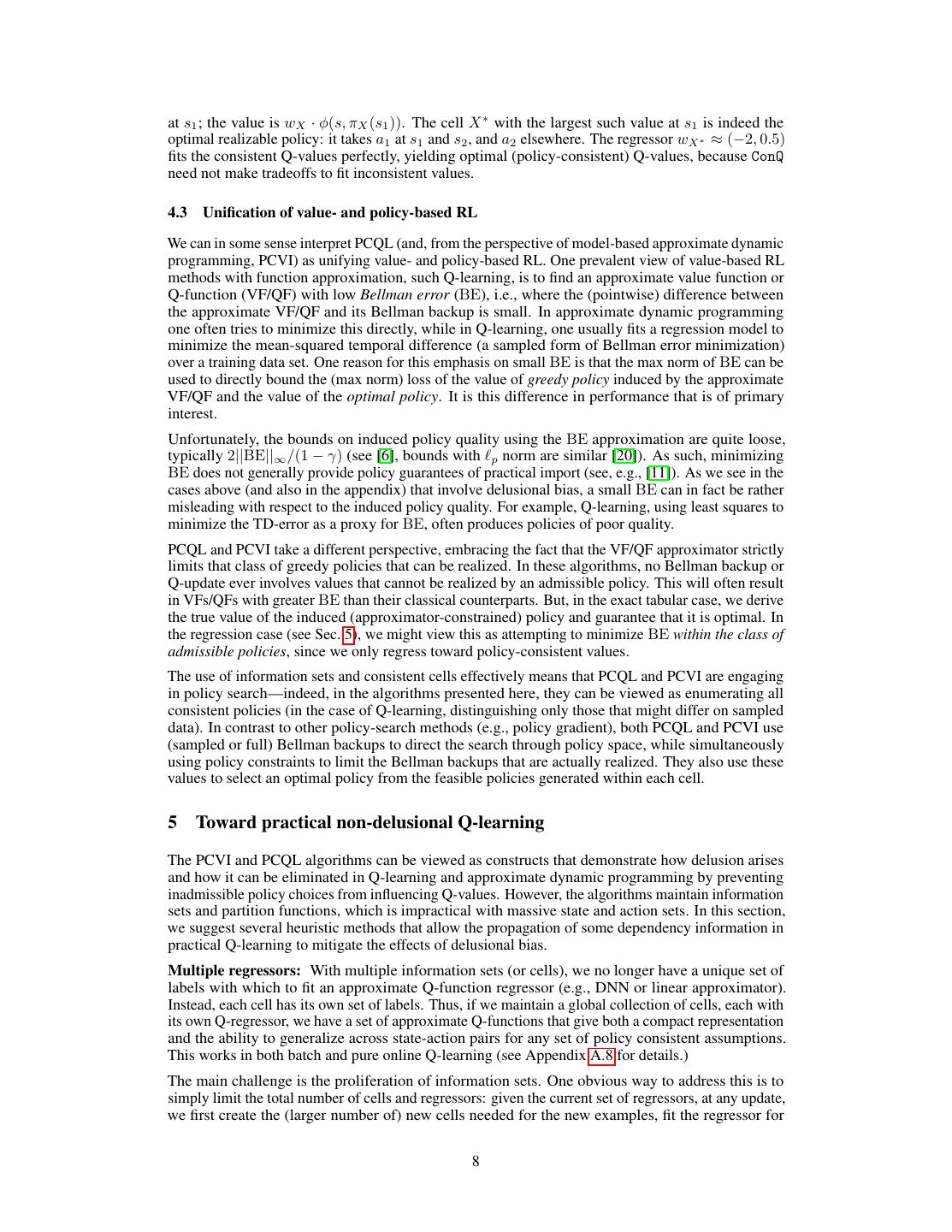 8 .at s1 ; the value is wX · φ(s, πX (s1 )). The cell X ∗ with the largest such value at s1 is indeed the optimal realizable policy: it takes a1 at s1 and s2 , and a2 elsewhere. The regressor wX ∗ ≈ (−2, 0.5) fits the consistent Q-values perfectly, yielding optimal (policy-consistent) Q-values, because ConQ need not make tradeoffs to fit inconsistent values. 4.3 Unification of value- and policy-based RL We can in some sense interpret PCQL (and, from the perspective of model-based approximate dynamic programming, PCVI) as unifying value- and policy-based RL. One prevalent view of value-based RL methods with function approximation, such Q-learning, is to find an approximate value function or Q-function (VF/QF) with low Bellman error (BE), i.e., where the (pointwise) difference between the approximate VF/QF and its Bellman backup is small. In approximate dynamic programming one often tries to minimize this directly, while in Q-learning, one usually fits a regression model to minimize the mean-squared temporal difference (a sampled form of Bellman error minimization) over a training data set. One reason for this emphasis on small BE is that the max norm of BE can be used to directly bound the (max norm) loss of the value of greedy policy induced by the approximate VF/QF and the value of the optimal policy. It is this difference in performance that is of primary interest. Unfortunately, the bounds on induced policy quality using the BE approximation are quite loose, typically 2||BE||∞ /(1 − γ) (see [6], bounds with p norm are similar [20]). As such, minimizing BE does not generally provide policy guarantees of practical import (see, e.g., [11]). As we see in the cases above (and also in the appendix) that involve delusional bias, a small BE can in fact be rather misleading with respect to the induced policy quality. For example, Q-learning, using least squares to minimize the TD-error as a proxy for BE, often produces policies of poor quality. PCQL and PCVI take a different perspective, embracing the fact that the VF/QF approximator strictly limits that class of greedy policies that can be realized. In these algorithms, no Bellman backup or Q-update ever involves values that cannot be realized by an admissible policy. This will often result in VFs/QFs with greater BE than their classical counterparts. But, in the exact tabular case, we derive the true value of the induced (approximator-constrained) policy and guarantee that it is optimal. In the regression case (see Sec. 5), we might view this as attempting to minimize BE within the class of admissible policies, since we only regress toward policy-consistent values. The use of information sets and consistent cells effectively means that PCQL and PCVI are engaging in policy search—indeed, in the algorithms presented here, they can be viewed as enumerating all consistent policies (in the case of Q-learning, distinguishing only those that might differ on sampled data). In contrast to other policy-search methods (e.g., policy gradient), both PCQL and PCVI use (sampled or full) Bellman backups to direct the search through policy space, while simultaneously using policy constraints to limit the Bellman backups that are actually realized. They also use these values to select an optimal policy from the feasible policies generated within each cell. 5 Toward practical non-delusional Q-learning The PCVI and PCQL algorithms can be viewed as constructs that demonstrate how delusion arises and how it can be eliminated in Q-learning and approximate dynamic programming by preventing inadmissible policy choices from influencing Q-values. However, the algorithms maintain information sets and partition functions, which is impractical with massive state and action sets. In this section, we suggest several heuristic methods that allow the propagation of some dependency information in practical Q-learning to mitigate the effects of delusional bias. Multiple regressors: With multiple information sets (or cells), we no longer have a unique set of labels with which to fit an approximate Q-function regressor (e.g., DNN or linear approximator). Instead, each cell has its own set of labels. Thus, if we maintain a global collection of cells, each with its own Q-regressor, we have a set of approximate Q-functions that give both a compact representation and the ability to generalize across state-action pairs for any set of policy consistent assumptions. This works in both batch and pure online Q-learning (see Appendix A.8 for details.) The main challenge is the proliferation of information sets. One obvious way to address this is to simply limit the total number of cells and regressors: given the current set of regressors, at any update, we first create the (larger number of) new cells needed for the new examples, fit the regressor for 8