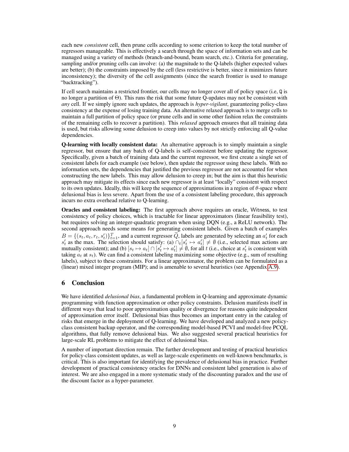 9 .each new consistent cell, then prune cells according to some criterion to keep the total number of regressors manageable. This is effectively a search through the space of information sets and can be managed using a variety of methods (branch-and-bound, beam search, etc.). Criteria for generating, sampling and/or pruning cells can involve: (a) the magnitude to the Q-labels (higher expected values are better); (b) the constraints imposed by the cell (less restrictive is better, since it minimizes future inconsistency); the diversity of the cell assignments (since the search frontier is used to manage “backtracking”). If cell search maintains a restricted frontier, our cells may no longer cover all of policy space (i.e, Q is no longer a partition of Θ). This runs the risk that some future Q-updates may not be consistent with any cell. If we simply ignore such updates, the approach is hyper-vigilant, guaranteeing policy-class consistency at the expense of losing training data. An alternative relaxed approach is to merge cells to maintain a full partition of policy space (or prune cells and in some other fashion relax the constraints of the remaining cells to recover a partition). This relaxed approach ensures that all training data is used, but risks allowing some delusion to creep into values by not strictly enforcing all Q-value dependencies. Q-learning with locally consistent data: An alternative approach is to simply maintain a single regressor, but ensure that any batch of Q-labels is self-consistent before updating the regressor. Specifically, given a batch of training data and the current regressor, we first create a single set of consistent labels for each example (see below), then update the regressor using these labels. With no information sets, the dependencies that justified the previous regressor are not accounted for when constructing the new labels. This may allow delusion to creep in; but the aim is that this heuristic approach may mitigate its effects since each new regressor is at least “locally” consistent with respect to its own updates. Ideally, this will keep the sequence of approximations in a region of θ-space where delusional bias is less severe. Apart from the use of a consistent labeling procedure, this approach incurs no extra overhead relative to Q-learning. Oracles and consistent labeling: The first approach above requires an oracle, Witness, to test consistency of policy choices, which is tractable for linear approximators (linear feasibility test), but requires solving an integer-quadratic program when using DQN (e.g., a ReLU network). The second approach needs some means for generating consistent labels. Given a batch of examples B = {(st , at , rt , st )}Tt=1 , and a current regressor Q, labels are generated by selecting an at for each st as the max. The selection should satisfy: (a) ∩t [st → at ] = ∅ (i.e., selected max actions are mutually consistent); and (b) [st → at ] ∩ [st → at ] = ∅, for all t (i.e., choice at st is consistent with taking at at st ). We can find a consistent labeling maximizing some objective (e.g., sum of resulting labels), subject to these constraints. For a linear approximator, the problem can be formulated as a (linear) mixed integer program (MIP); and is amenable to several heuristics (see Appendix A.9). 6 Conclusion We have identified delusional bias, a fundamental problem in Q-learning and approximate dynamic programming with function approximation or other policy constraints. Delusion manifests itself in different ways that lead to poor approximation quality or divergence for reasons quite independent of approximation error itself. Delusional bias thus becomes an important entry in the catalog of risks that emerge in the deployment of Q-learning. We have developed and analyzed a new policy- class consistent backup operator, and the corresponding model-based PCVI and model-free PCQL algorithms, that fully remove delusional bias. We also suggested several practical heuristics for large-scale RL problems to mitigate the effect of delusional bias. A number of important direction remain. The further development and testing of practical heuristics for policy-class consistent updates, as well as large-scale experiments on well-known benchmarks, is critical. This is also important for identifying the prevalence of delusional bias in practice. Further development of practical consistency oracles for DNNs and consistent label generation is also of interest. We are also engaged in a more systematic study of the discounting paradox and the use of the discount factor as a hyper-parameter. 9