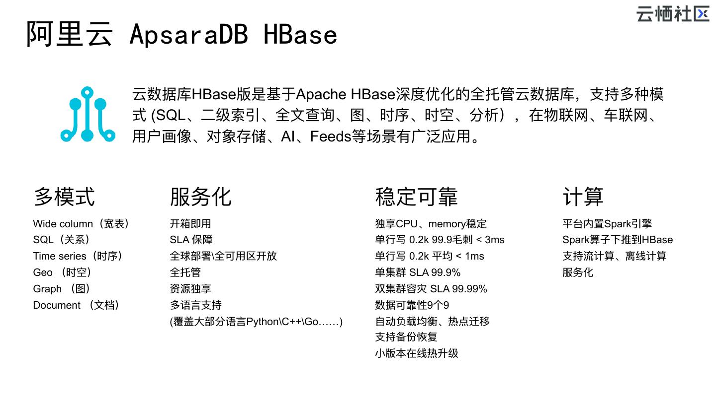 6 .阿里云 ApsaraDB HBase 云数据库HBase版是基于Apache HBase深度优化的全托管云数据库,⽀支持多种模 式 (SQL、⼆二级索引、全⽂文查询、图、时序、时空、分析),在物联⽹网、⻋车联⽹网、 ⽤用户画像、对象存储、AI、Feeds等场景有⼴广泛应⽤用。 多模式 服务化 稳定可靠 计算 Wide column(宽表) 开箱即⽤用 独享CPU、memory稳定 平台内置Spark引擎 SQL(关系) SLA 保障 单⾏行行写 0.2k 99.9⽑毛刺刺 < 3ms Spark算⼦子下推到HBase Time series(时序) 全球部署\全可⽤用区开放 单⾏行行写 0.2k 平均 < 1ms ⽀支持流计算、离线计算 Geo (时空) 全托管 单集群 SLA 99.9% 服务化 Graph (图) 资源独享 双集群容灾 SLA 99.99% Document (⽂文档) 多语⾔言⽀支持 数据可靠性9个9 (覆盖⼤大部分语⾔言Python\C++\Go……) ⾃自动负载均衡、热点迁移 ⽀支持备份恢复 ⼩小版本在线热升级