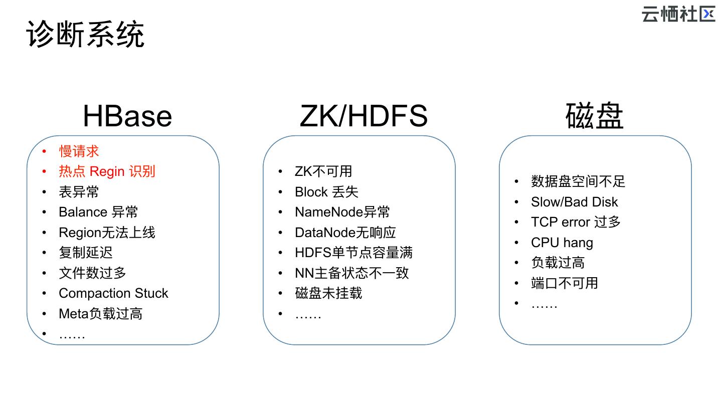 14 .诊断系统 HBase ZK/HDFS 磁盘 • 慢请求 • 热点 Regin 识别 • ZK不不可⽤用 • 数据盘空间不不⾜足 • 表异常 • Block 丢失 • Slow/Bad Disk • Balance 异常 • NameNode异常 • TCP error 过多 • Region⽆无法上线 • DataNode⽆无响应 • CPU hang • 复制延迟 • HDFS单节点容量量满 • 负载过⾼高 • ⽂文件数过多 • NN主备状态不不⼀一致 • 端⼝口不不可⽤用 • Compaction Stuck • 磁盘未挂载 • …… • Meta负载过⾼高 • …… • ……