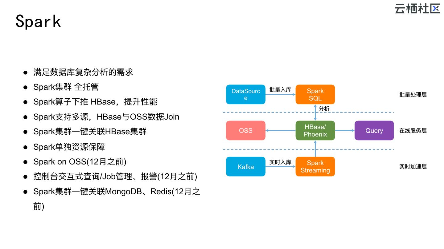 18 .Spark l 满⾜足数据库复杂分析的需求 l Spark集群 全托管 DataSourc 批量量⼊入库 Spark 批量量处理理层 e SQL l Spark算⼦子下推 HBase,提升性能 分析 l Spark⽀支持多源,HBase与OSS数据Join HBase/ l Spark集群⼀一键关联HBase集群 OSS Query 在线服务层 Phoenix l Spark单独资源保障 l Spark on OSS(12⽉月之前) 实时⼊入库 Spark Kafka 实时加速层 Streaming l 控制台交互式查询/Job管理理、报警(12⽉月之前) l Spark集群⼀一键关联MongoDB、Redis(12⽉月之 前)