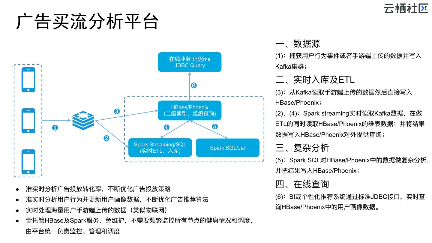 26 .广告买流分析平台 ⼀一、数据源 在线业务 延迟ms (1):捕获⽤用户⾏行行为事件或者⼿手游端上传的数据并写⼊入 JDBC Query Kafka集群; ⼆二、实时⼊入库及ETL ❻ (3):从Kafka读取⼿手游端上传的数据然后直接写⼊入 HBase/Phoenix; HBase/Phoenix ❸ (⼆二级索引、组织查询) (2)、(4):Spark streaming实时读取Kafka数据,在做 ETL的同时读取HBase/Phoenix的维表数据;并将结果 ❶ ❹ ❺ 数据写⼊入HBase/Phoenix对外提供查询; ❷ Spark Streaming/SQL (实时ETL、⼊入库) Spark SQL/Jar 三、复杂分析 (5):Spark SQL对HBase/Phoenix中的数据做复杂分析, 并把结果写⼊入HBase/Phoenix; l 准实时分析⼴广告投放转化率,不不断优化⼴广告投放策略略 四、在线查询 l 准实时分析⽤用户⾏行行为并更更新⽤用户画像数据,不不断优化⼴广告推荐算法 (6):BI或个性化推荐系统通过标准JDBC接⼝口,实时查 询HBase/Phoenix中的⽤用户画像数据。 l 实时处理理海海量量⽤用户⼿手游端上传的数据(类似物联⽹网) l 全托管HBase及Spark服务,免维护,不不需要频繁监控所有节点的健康情况和调度, 由平台统⼀一负责监控、管理理和调度