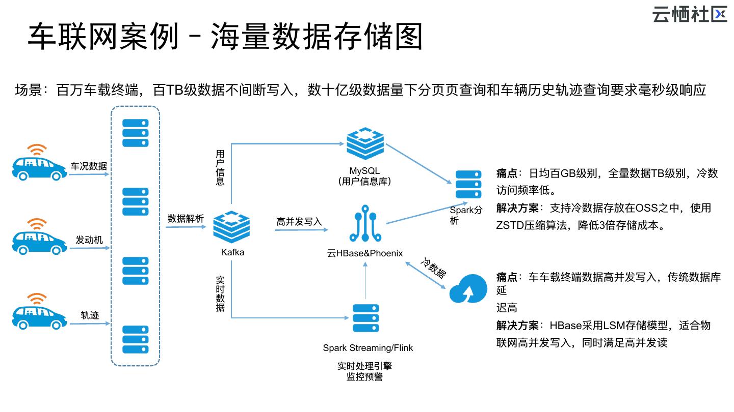 29 . 车联网案例–海量数据存储图 场景:百万⻋车载终端,百TB级数据不不间断写⼊入,数⼗十亿级数据量量下分⻚页⻚页查询和⻋车辆历史轨迹查询要求毫秒级响应 ⽤用 ⻋车况数据 户 信 MySQL 痛点:⽇日均百GB级别,全量量数据TB级别,冷数 息 (⽤用户信息库) 访问频率低。 Spark分 解决⽅方案:⽀支持冷数据存放在OSS之中,使⽤用 数据解析 ⾼高并发写⼊入 析 ZSTD压缩算法,降低3倍存储成本。 发动机 Kafka 云HBase&Phoenix 实 痛点:⻋车⻋车载终端数据⾼高并发写⼊入,传统数据库 时 延 数 据 迟⾼高 轨迹 解决⽅方案:HBase采⽤用LSM存储模型,适合物 Spark Streaming/Flink 联⽹网⾼高并发写⼊入,同时满⾜足⾼高并发读 实时处理理引擎 监控预警