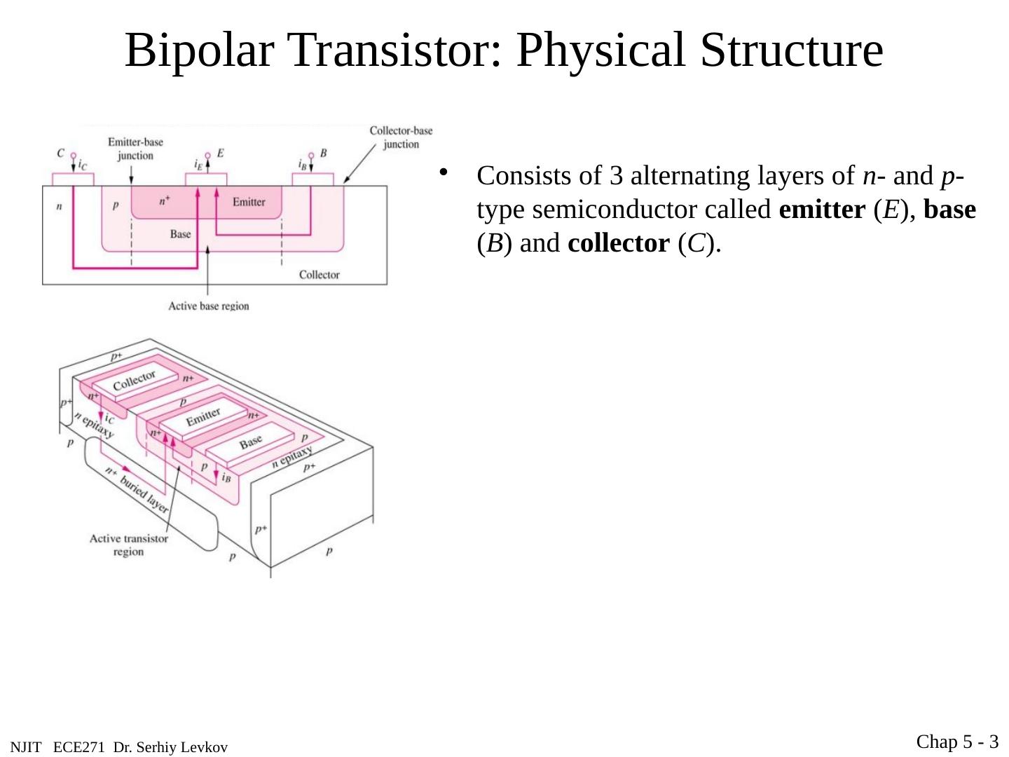 4 .NJIT ECE271 Dr. Serhiy Levkov Bipolar Transistor: Physical Structure Consists of 3 alternating layers of n - and p -type semiconductor called emitter ( E ), base ( B ) and collector ( C ). Majority of current enters collector, crosses base region and exits through emitter. A small current also enters base terminal, crosses base-emitter junction and exits through emitter . Chap 5 - 4