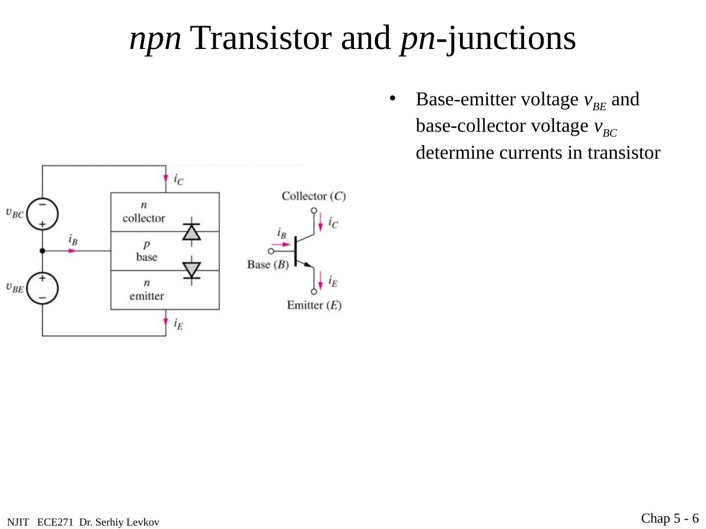 6 .NJIT ECE271 Dr. Serhiy Levkov npn Transistor and pn- junctions Base-emitter voltage v BE and base-collector voltage v BC determine currents in transistor Chap 5 - 6