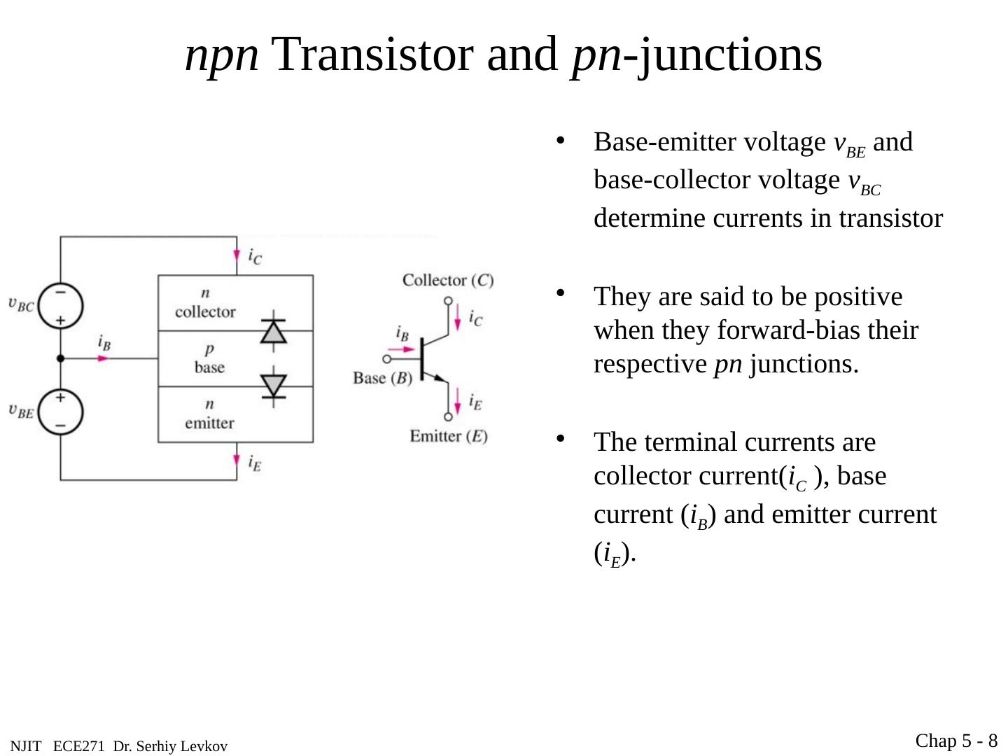 7 .NJIT ECE271 Dr. Serhiy Levkov npn Transistor and pn- junctions Base-emitter voltage v BE and base-collector voltage v BC determine currents in transistor They are said to be positive when they forward-bias their respective pn junctions. Chap 5 - 7