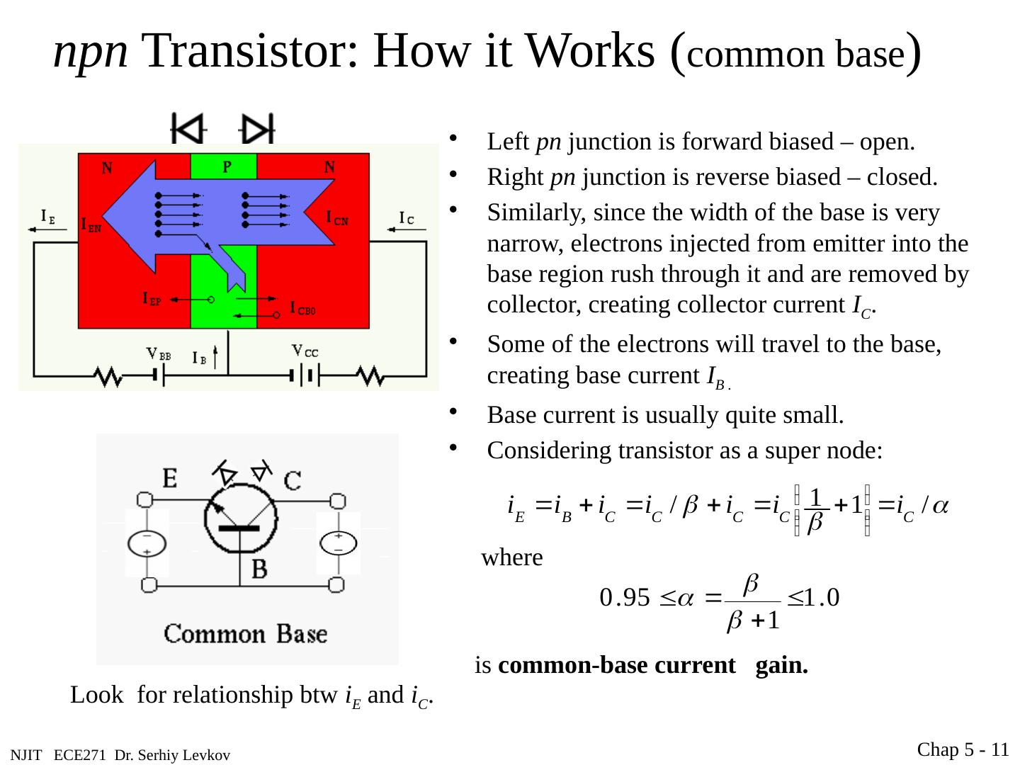 11 .NJIT ECE271 Dr. Serhiy Levkov npn Transistor: How it Works ( common base ) Left pn junction is forward biased – open. Right pn junction is reverse biased – closed. Similarly, since the width of the base is very narrow, electrons injected from emitter into the base region rush through it and are removed by collector, creating collector current I C . Some of the electrons will travel to the base, creating base current I B . Base current is usually quite small. Considering transistor as a super node: where is common-base current gain. Chap 5 - 11 Look for relationship btw i E and i C .