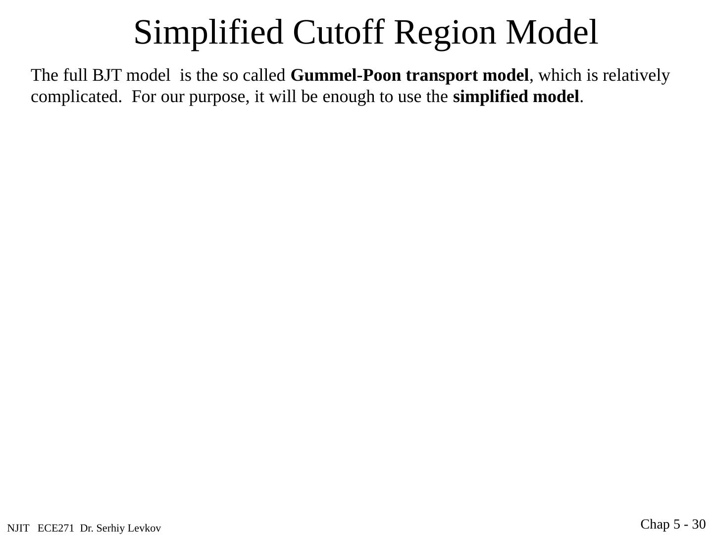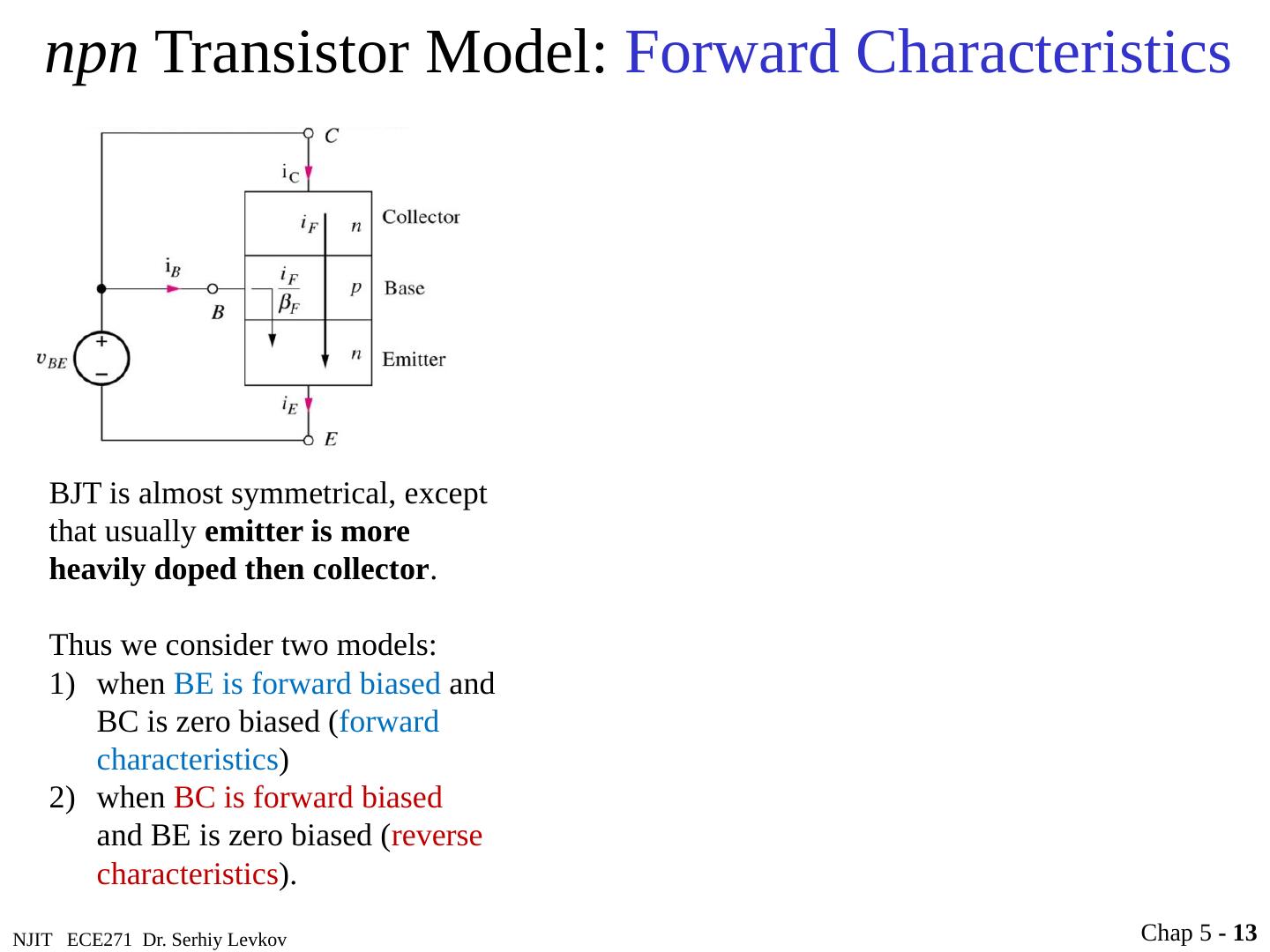 12 .NJIT ECE271 Dr. Serhiy Levkov npn Transistor Model: Forward Characteristics BJT is almost symmetrical, except that usually emitter is more heavily doped then collector . Thus we consider two models: when BE is forward biased and BC is zero biased ( forward characteristics ) Chap 5 - 12