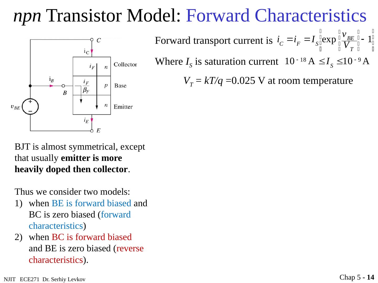 13 .NJIT ECE271 Dr. Serhiy Levkov npn Transistor Model: Forward Characteristics BJT is almost symmetrical, except that usually emitter is more heavily doped then collector . Thus we consider two models: when BE is forward biased and BC is zero biased ( forward characteristics ) when BC is forward biased and BE is zero biased ( reverse characteristics ). Chap 5 - 13