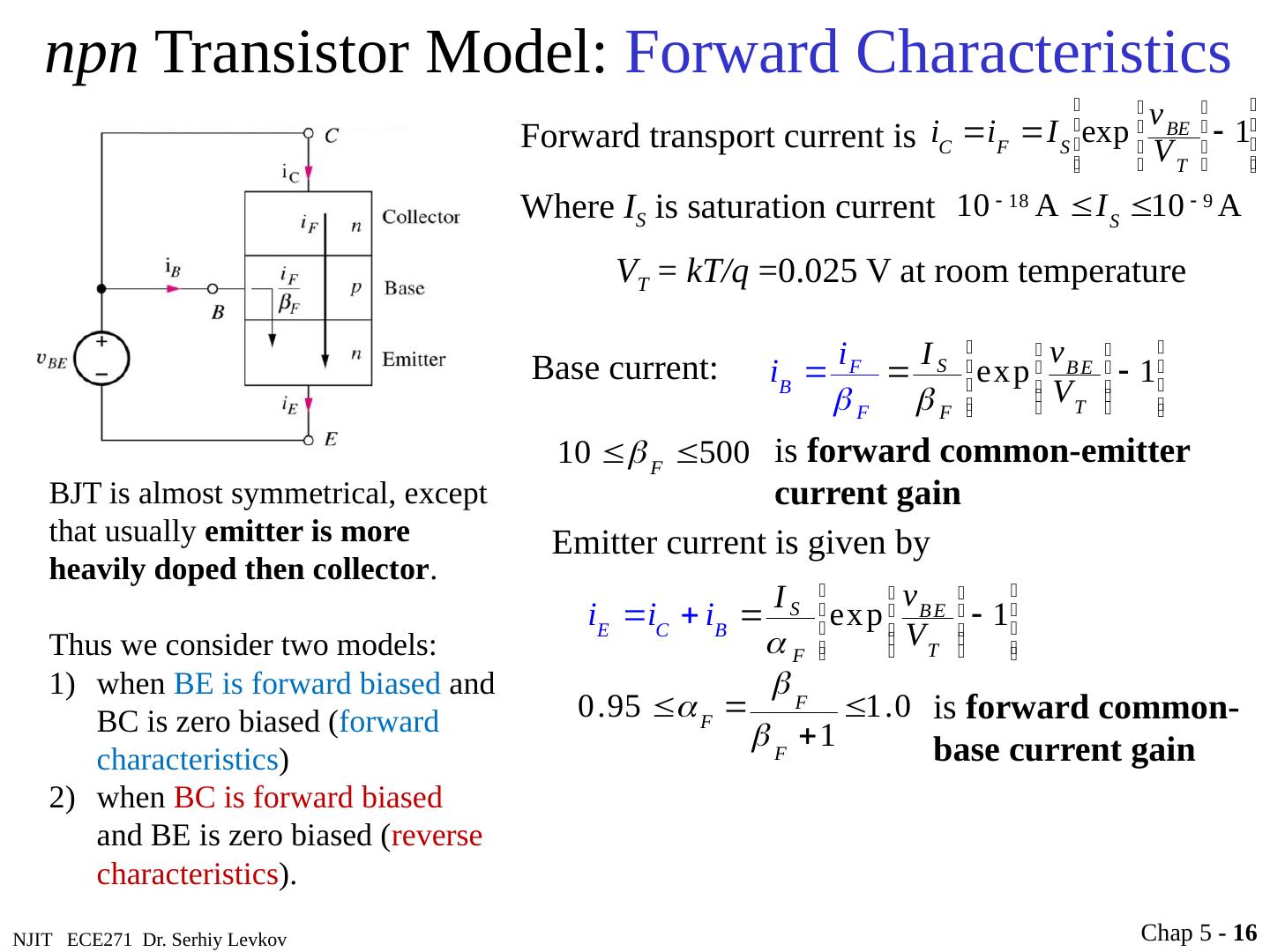 14 .NJIT ECE271 Dr. Serhiy Levkov npn Transistor Model: Forward Characteristics Forward transport current is Where I S is saturation current V T = kT/q =0.025 V at room temperature Chap 5 - 14 BJT is almost symmetrical, except that usually emitter is more heavily doped then collector . Thus we consider two models: when BE is forward biased and BC is zero biased ( forward characteristics ) when BC is forward biased and BE is zero biased ( reverse characteristics ).