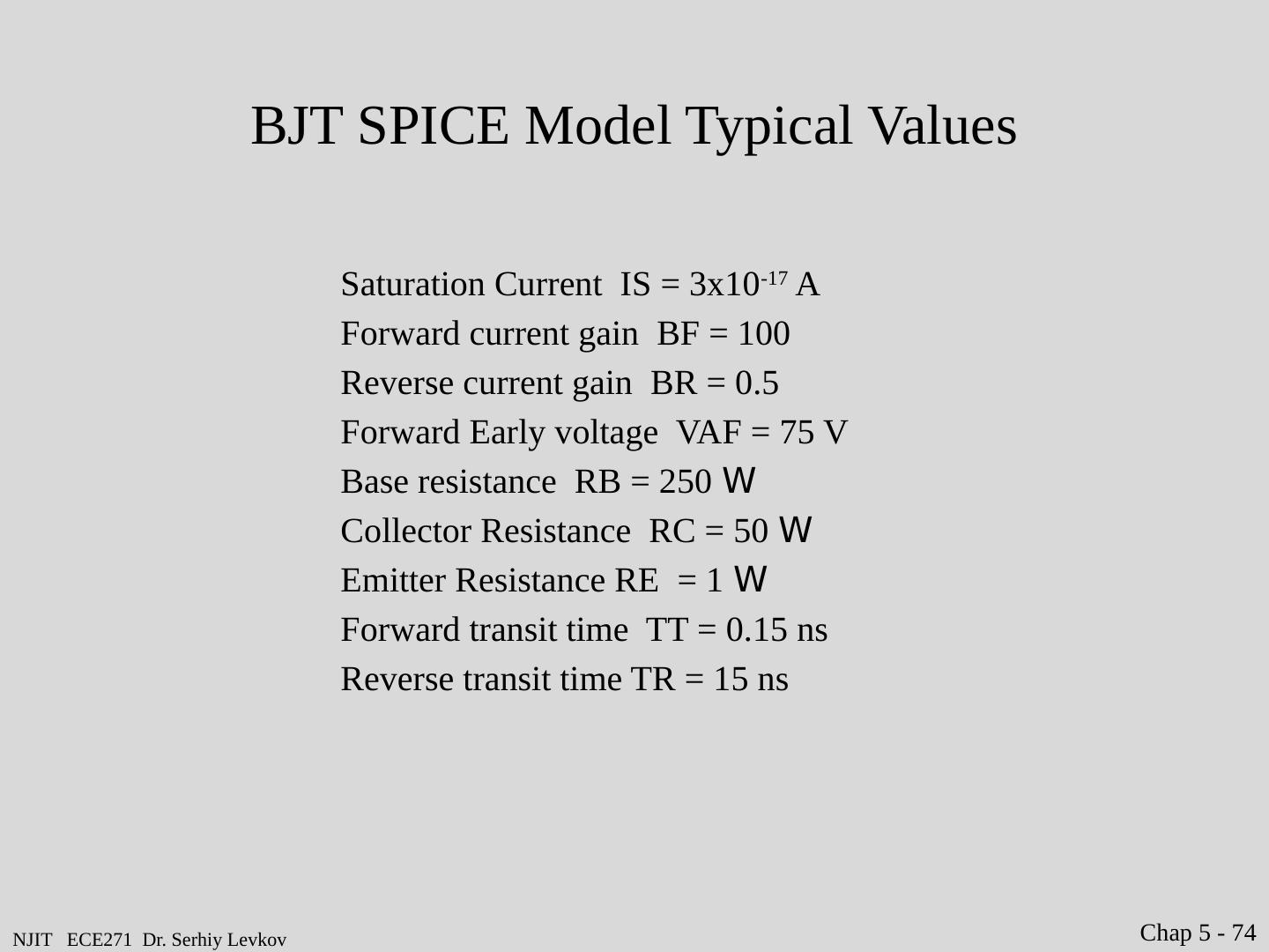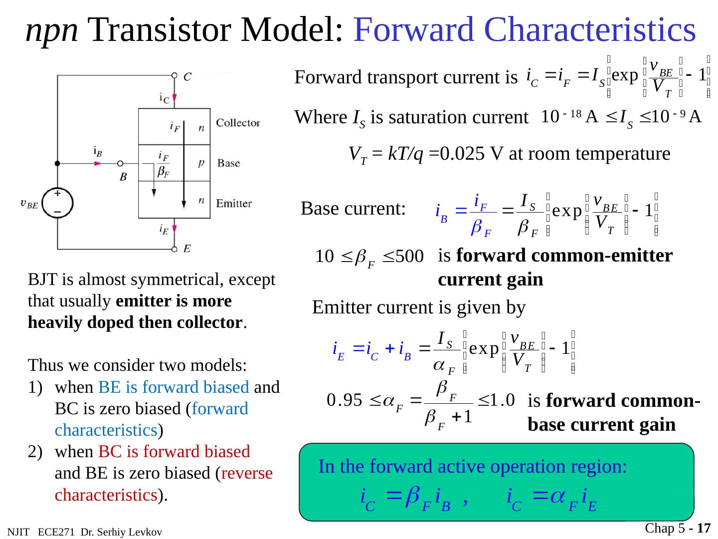 16 .NJIT ECE271 Dr. Serhiy Levkov npn Transistor Model: Forward Characteristics Forward transport current is Where I S is saturation current V T = kT/q =0.025 V at room temperature Emitter current is given by is forward common-emitter current gain is forward common- base current gain Chap 5 - 16 Base current: BJT is almost symmetrical, except that usually emitter is more heavily doped then collector . Thus we consider two models: when BE is forward biased and BC is zero biased ( forward characteristics ) when BC is forward biased and BE is zero biased ( reverse characteristics ).