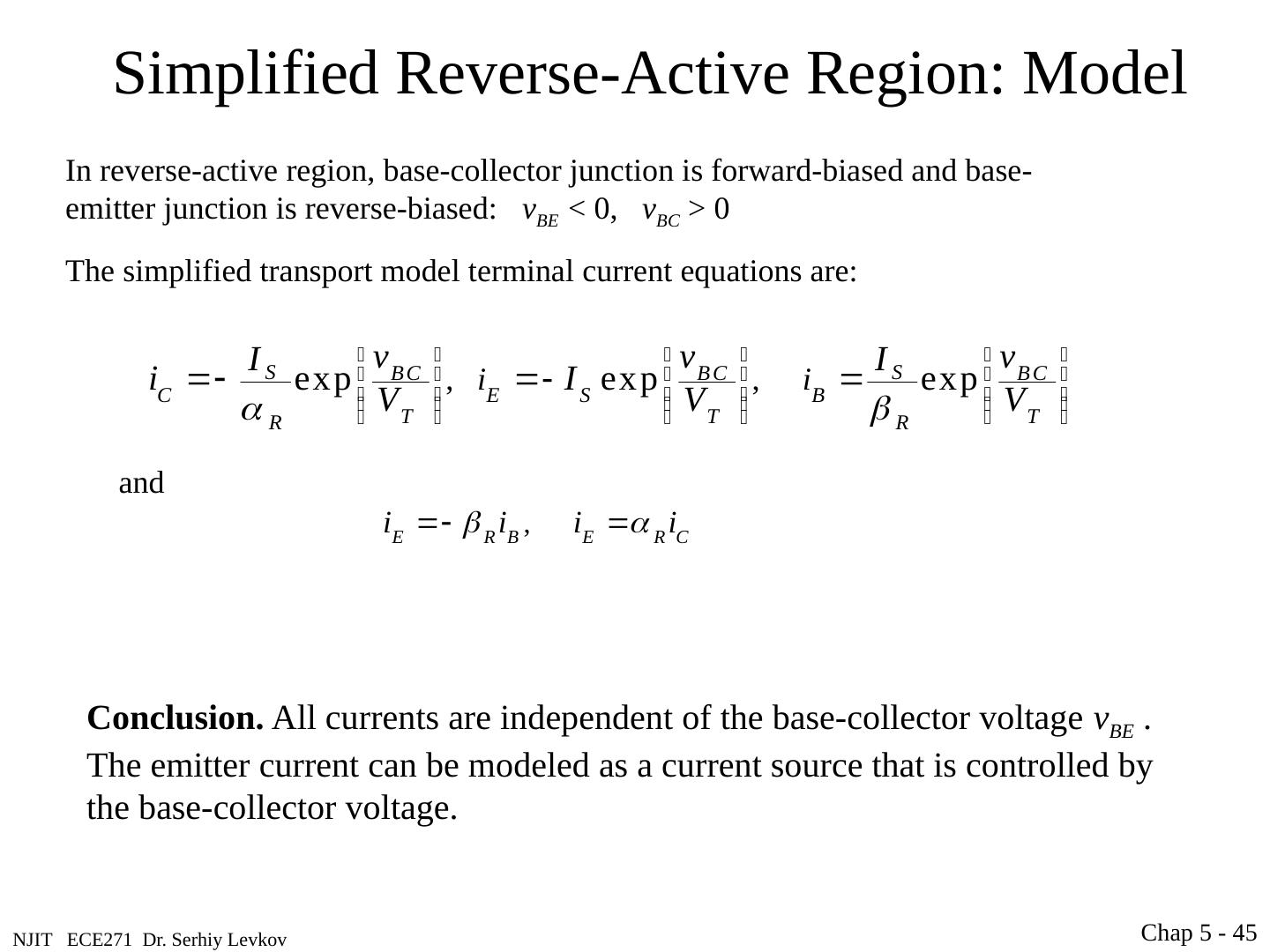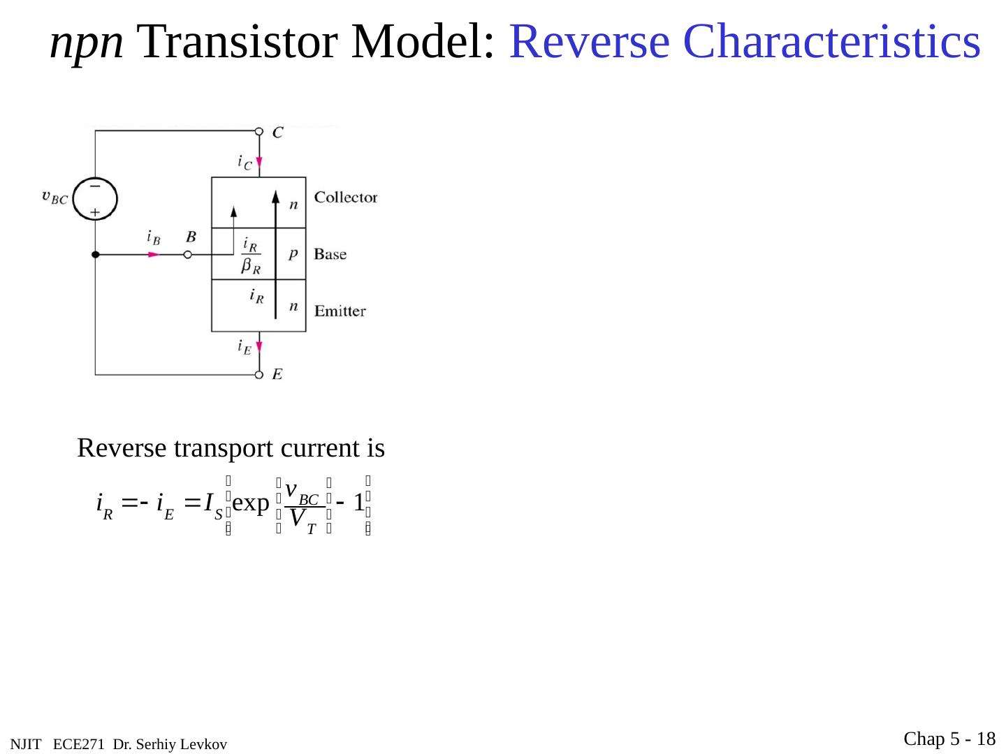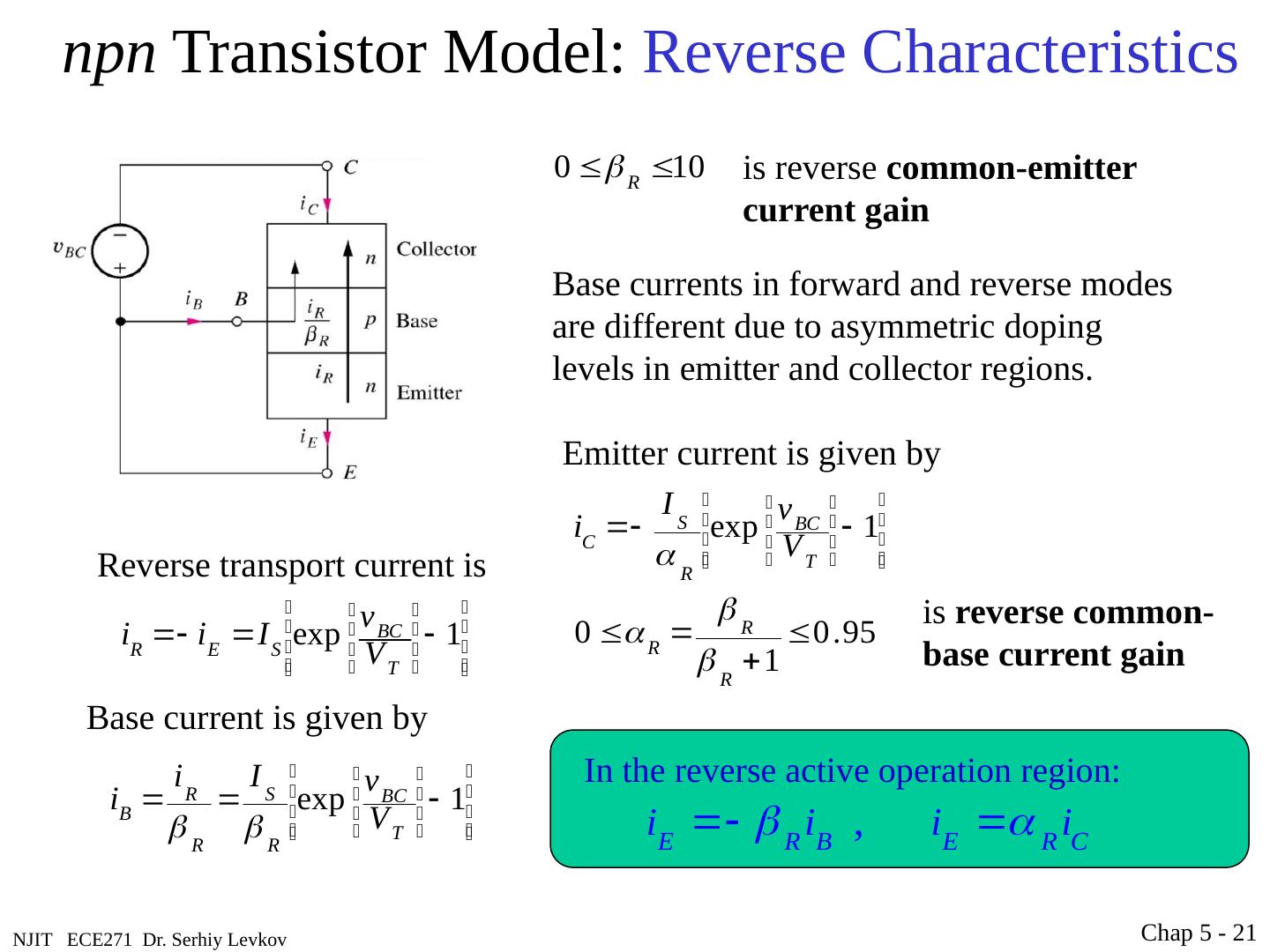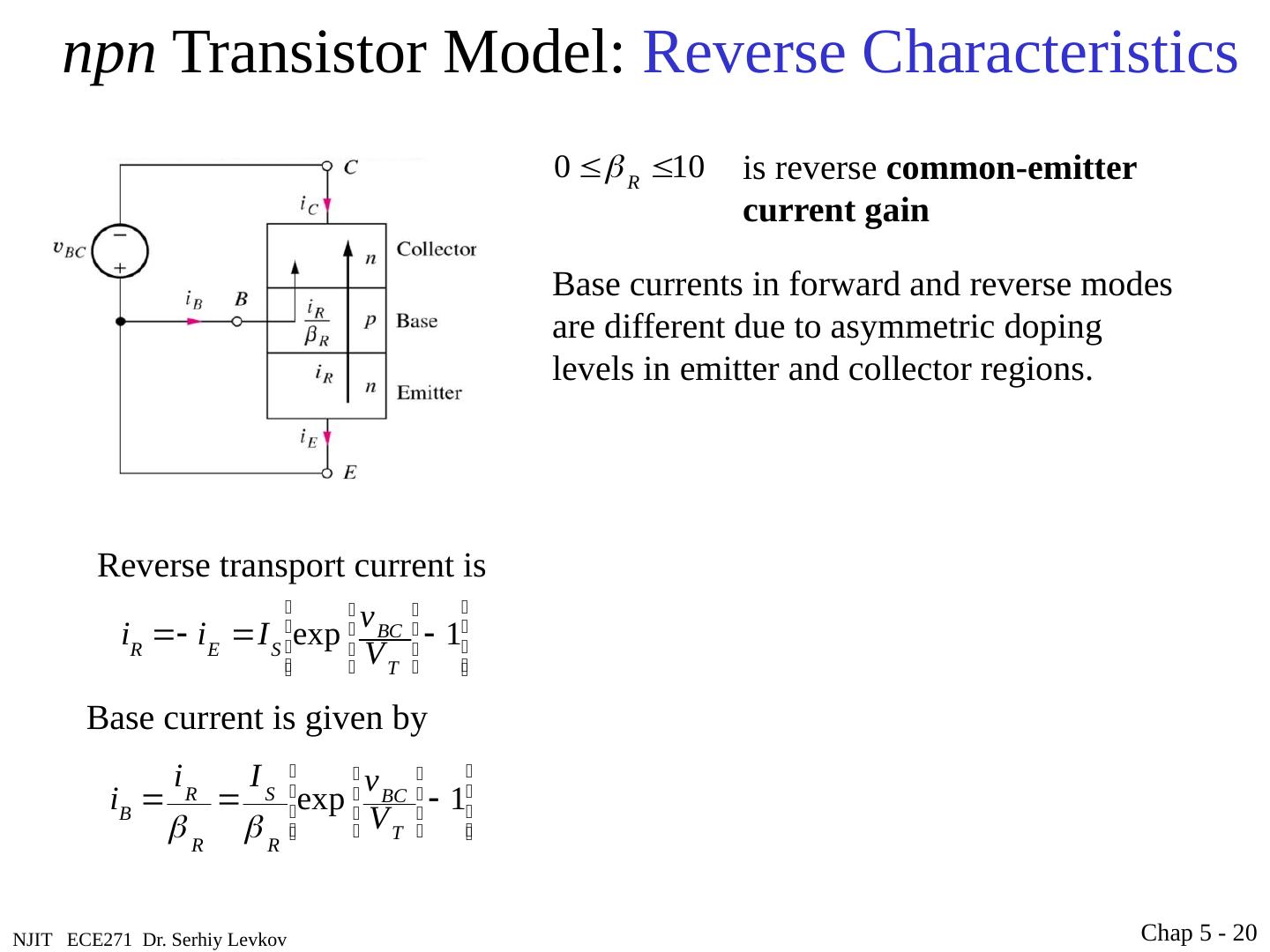 19 .NJIT ECE271 Dr. Serhiy Levkov npn Transistor Model: Reverse Characteristics Reverse transport current is Base current is given by Chap 5 - 19 is reverse common-emitter current gain
