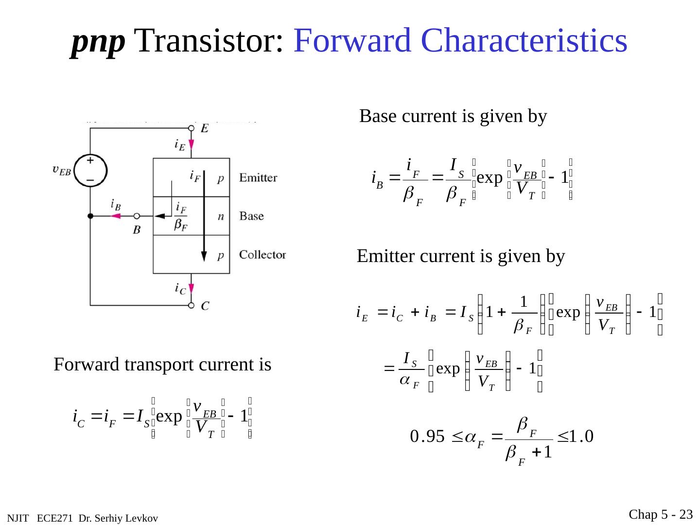 23 .NJIT ECE271 Dr. Serhiy Levkov pnp Transistor: Forward Characteristics Forward transport current is Base current is given by Emitter current is given by Chap 5 - 23