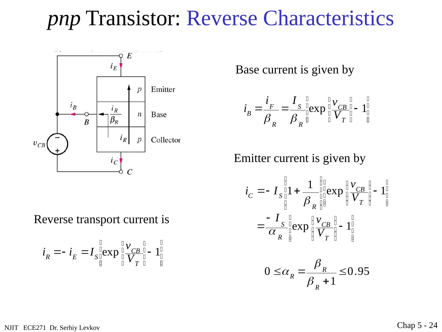 24 .NJIT ECE271 Dr. Serhiy Levkov pnp Transistor: Reverse Characteristics Reverse transport current is Base current is given by Emitter current is given by Chap 5 - 24