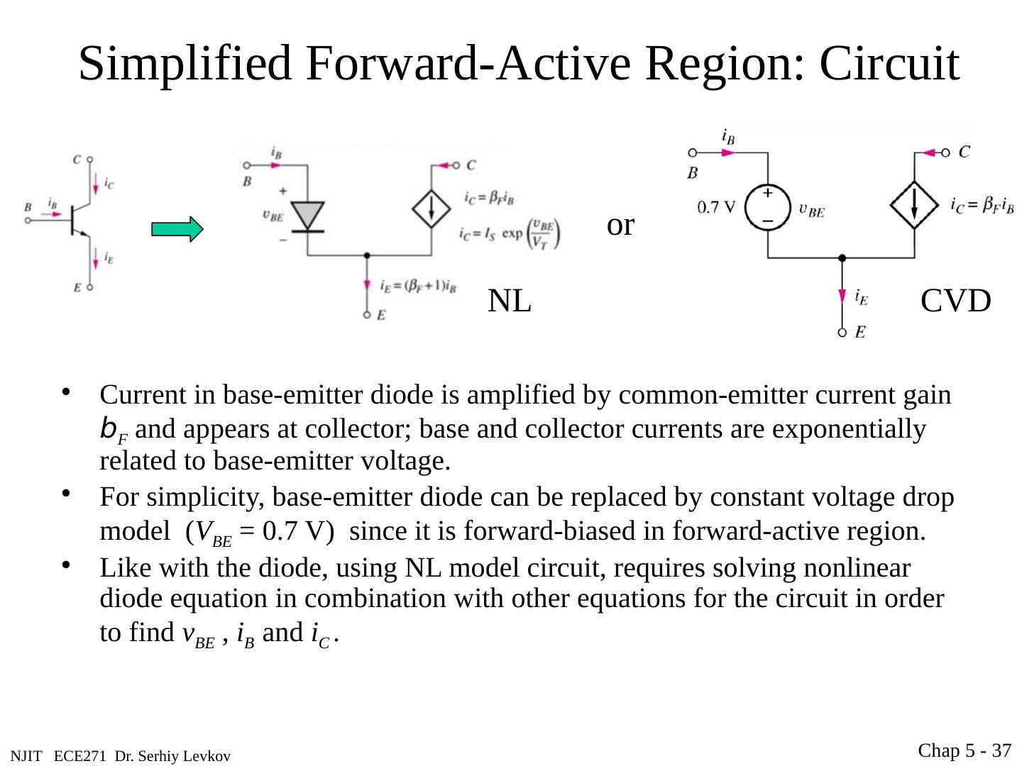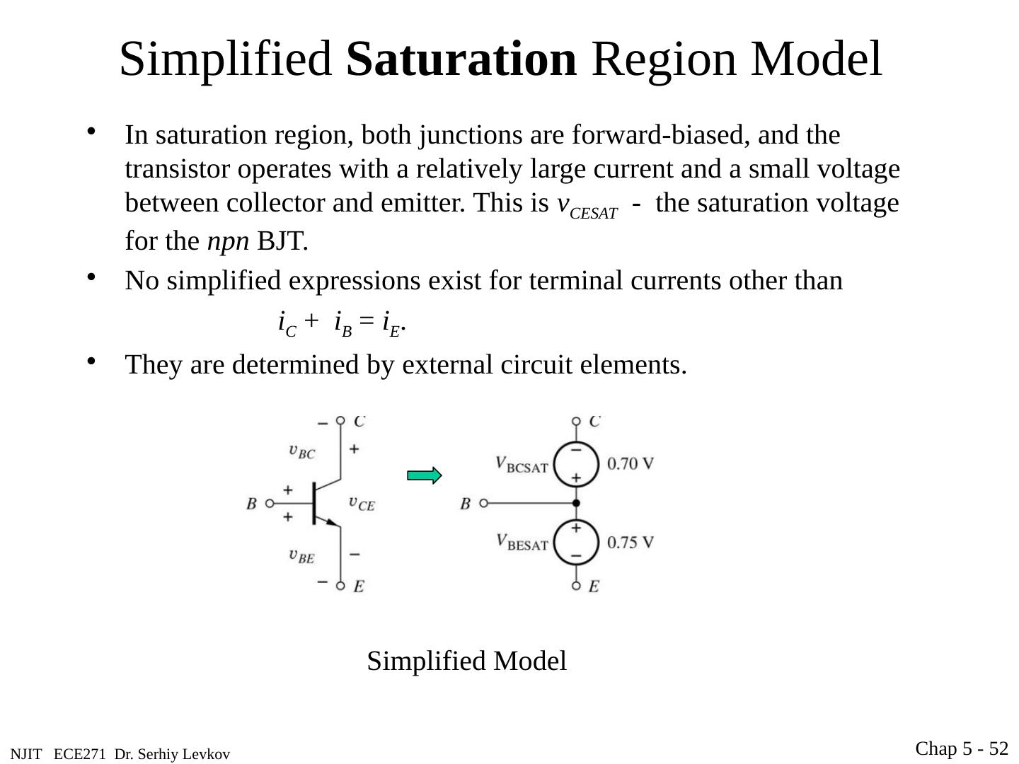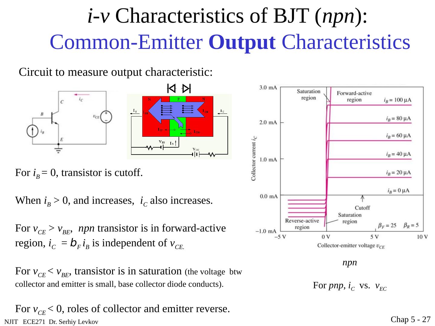 27 .NJIT ECE271 Dr. Serhiy Levkov i-v Characteristics of BJT ( npn ): Common-Emitter Output Characteristics For i B = 0, transistor is cutoff. When i B > 0, and increases, i C also increases. For v CE > v BE , npn transistor is in forward-active region, i C = b F i B is independent of v CE . For v CE < v BE , transistor is in saturation (the voltage btw collector and emitter is small, base collector diode conducts). For v CE < 0, roles of collector and emitter reverse. Chap 5 - 27 npn For pnp , i C vs. v EC Circuit to measure output characteristic: