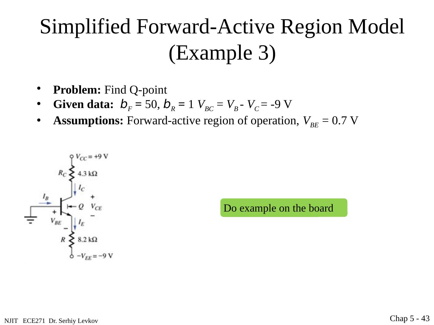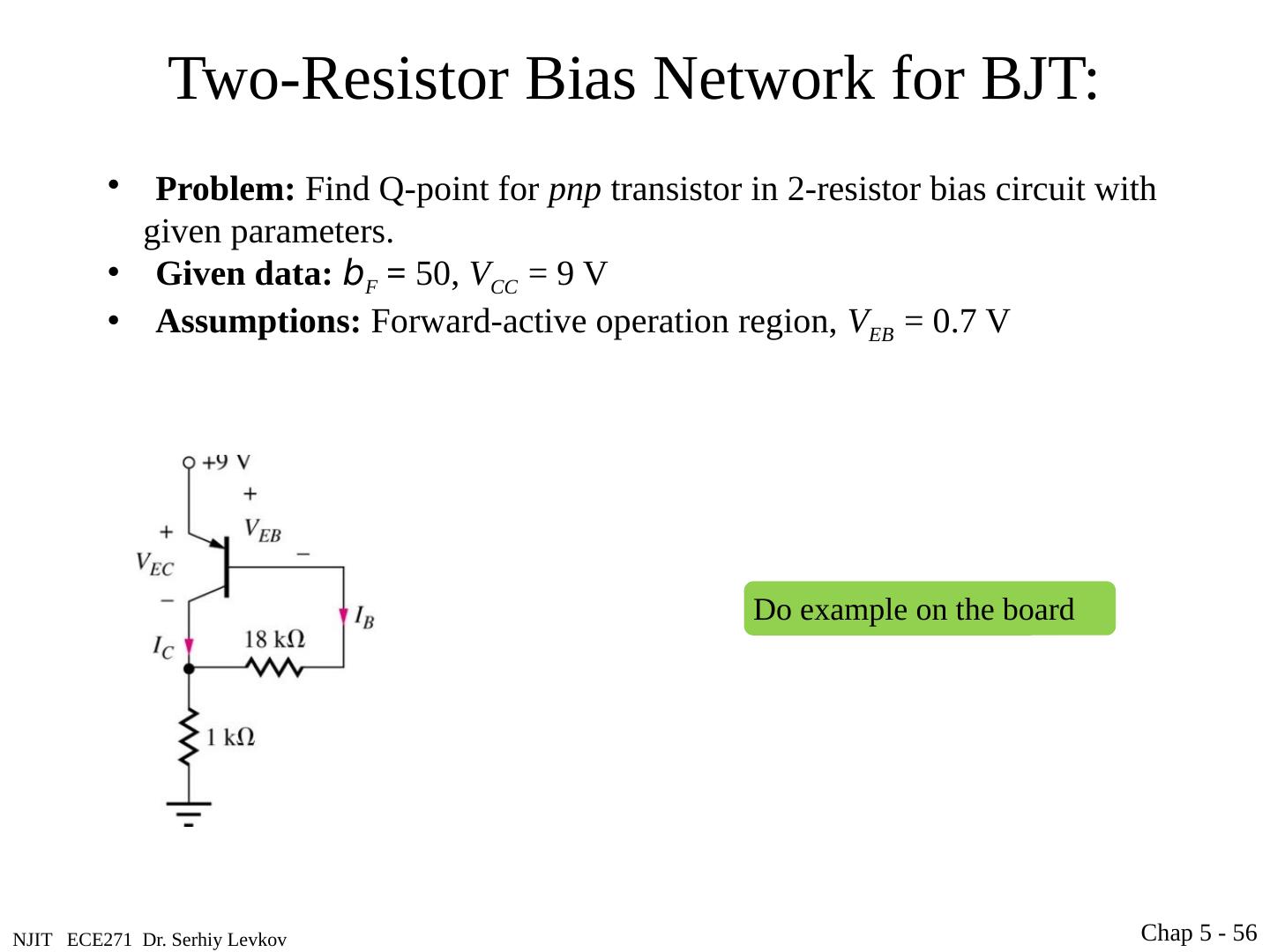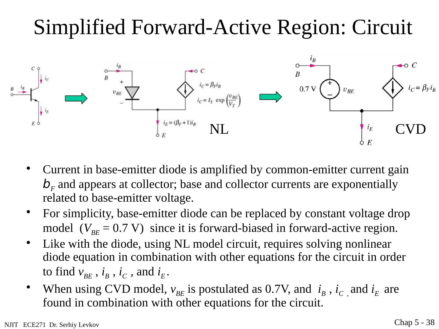27 .NJIT ECE271 Dr. Serhiy Levkov i-v Characteristics of BJT ( npn ): Common-Emitter Output Characteristics For i B = 0, transistor is cutoff. When i B > 0, and increases, i C also increases. For v CE > v BE , npn transistor is in forward-active region, i C = b F i B is independent of v CE . For v CE < v BE , transistor is in saturation (the voltage btw collector and emitter is small, base collector diode conducts). For v CE < 0, roles of collector and emitter reverse. Chap 5 - 27 npn For pnp , i C vs. v EC Circuit to measure output characteristic: