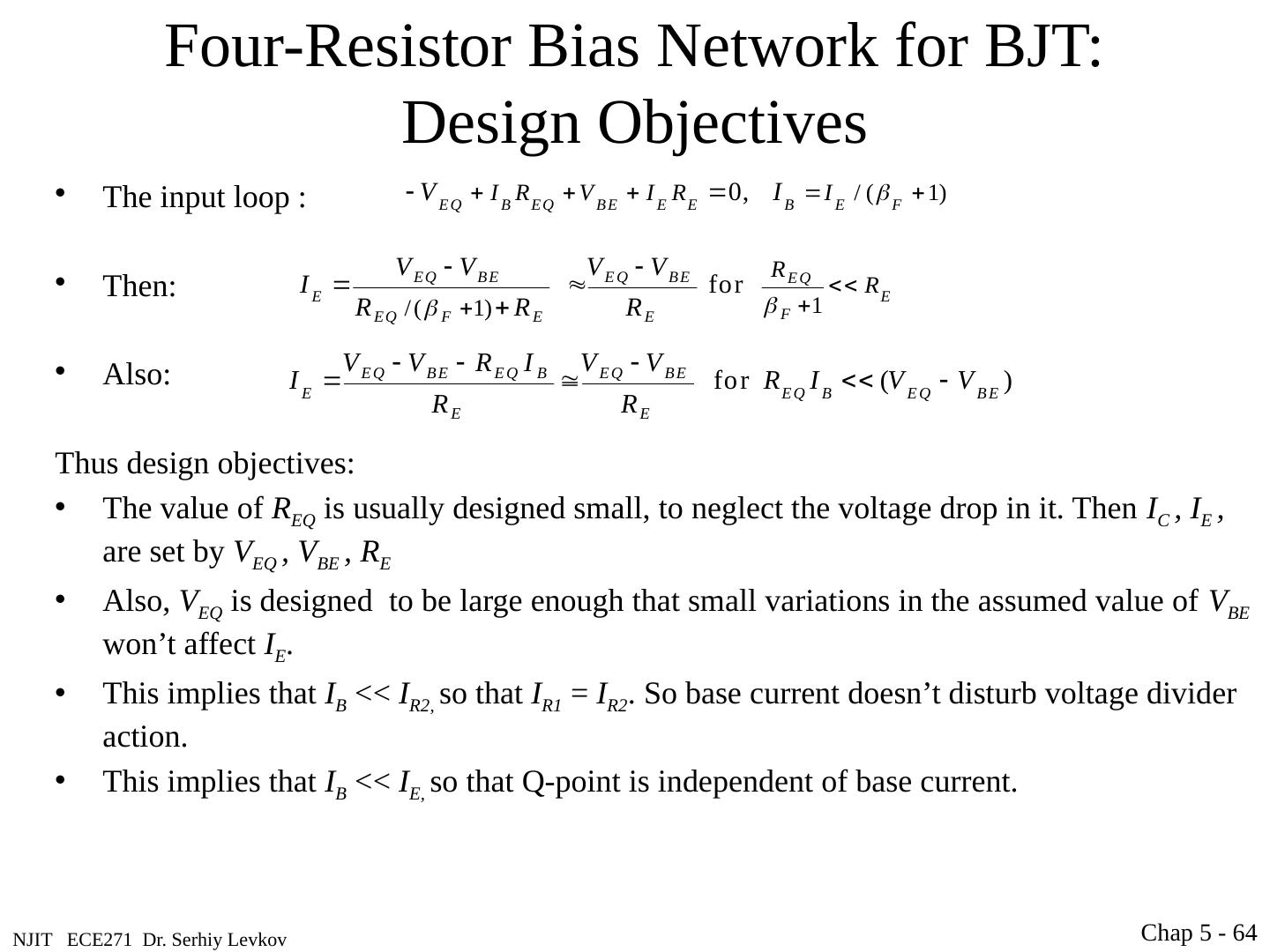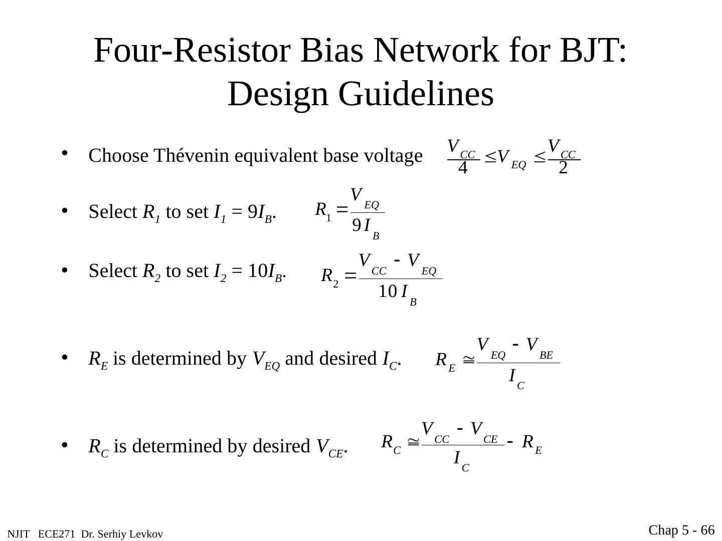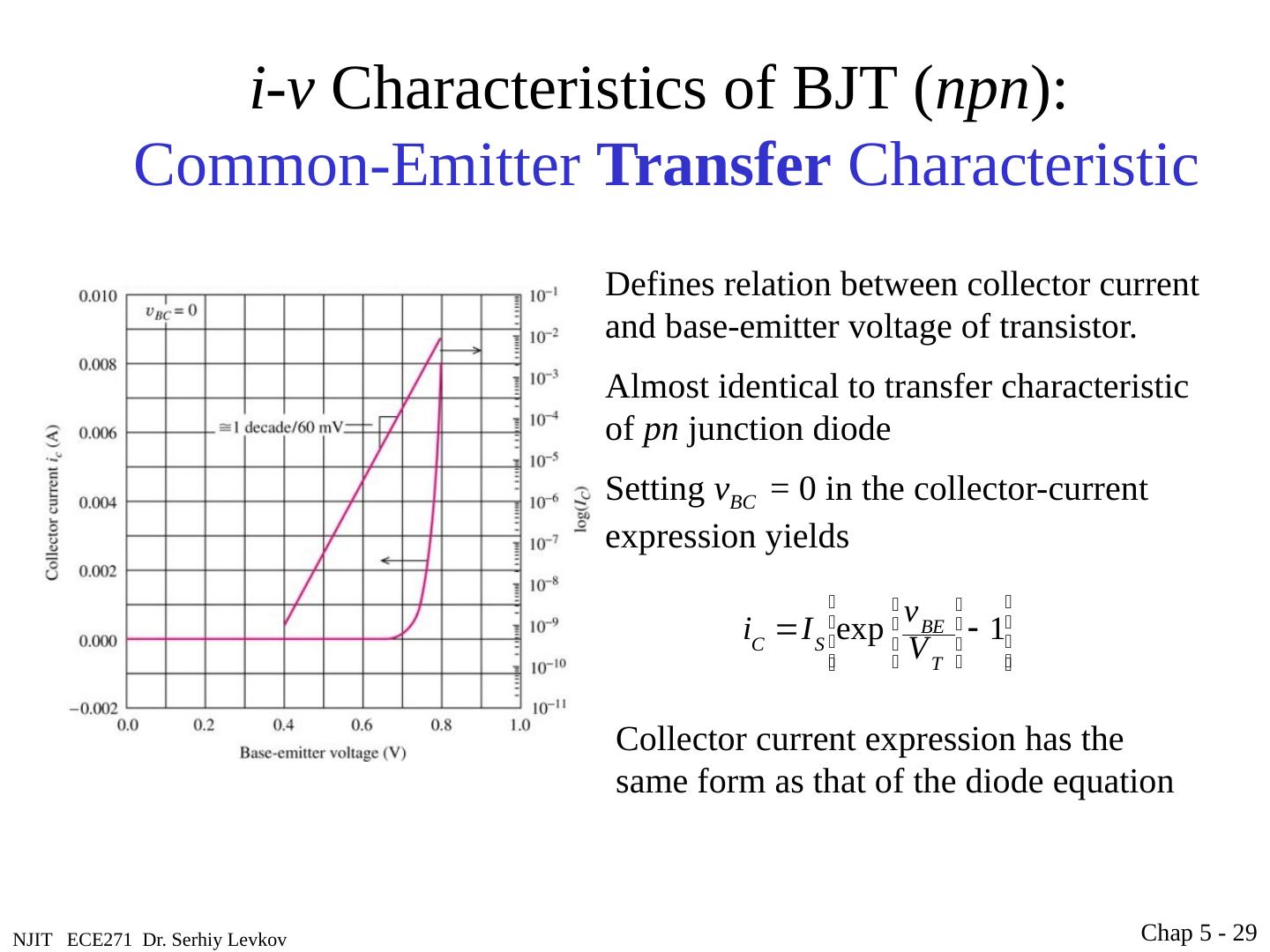 29 .NJIT ECE271 Dr. Serhiy Levkov i-v Characteristics of BJT ( npn ): Common-Emitter Transfer Characteristic Defines relation between collector current and base-emitter voltage of transistor. Almost identical to transfer characteristic of pn junction diode Setting v BC = 0 in the collector-current expression yields Chap 5 - 29 Collector current expression has the same form as that of the diode equation
