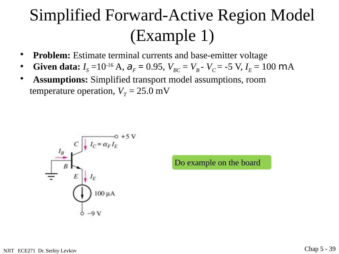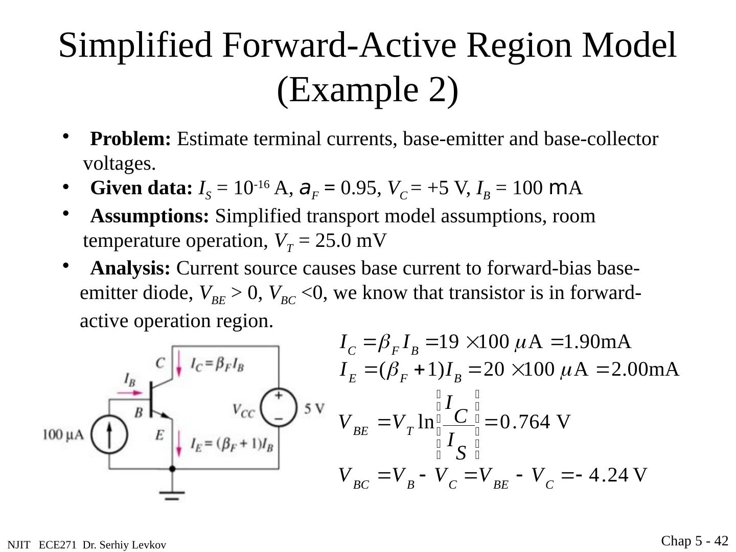 17 .NJIT ECE271 Dr. Serhiy Levkov npn Transistor Model: Forward Characteristics Forward transport current is Where I S is saturation current V T = kT/q =0.025 V at room temperature Emitter current is given by is forward common-emitter current gain is forward common- base current gain In the forward active operation region: Chap 5 - 17 Base current: BJT is almost symmetrical, except that usually emitter is more heavily doped then collector . Thus we consider two models: when BE is forward biased and BC is zero biased ( forward characteristics ) when BC is forward biased and BE is zero biased ( reverse characteristics ).