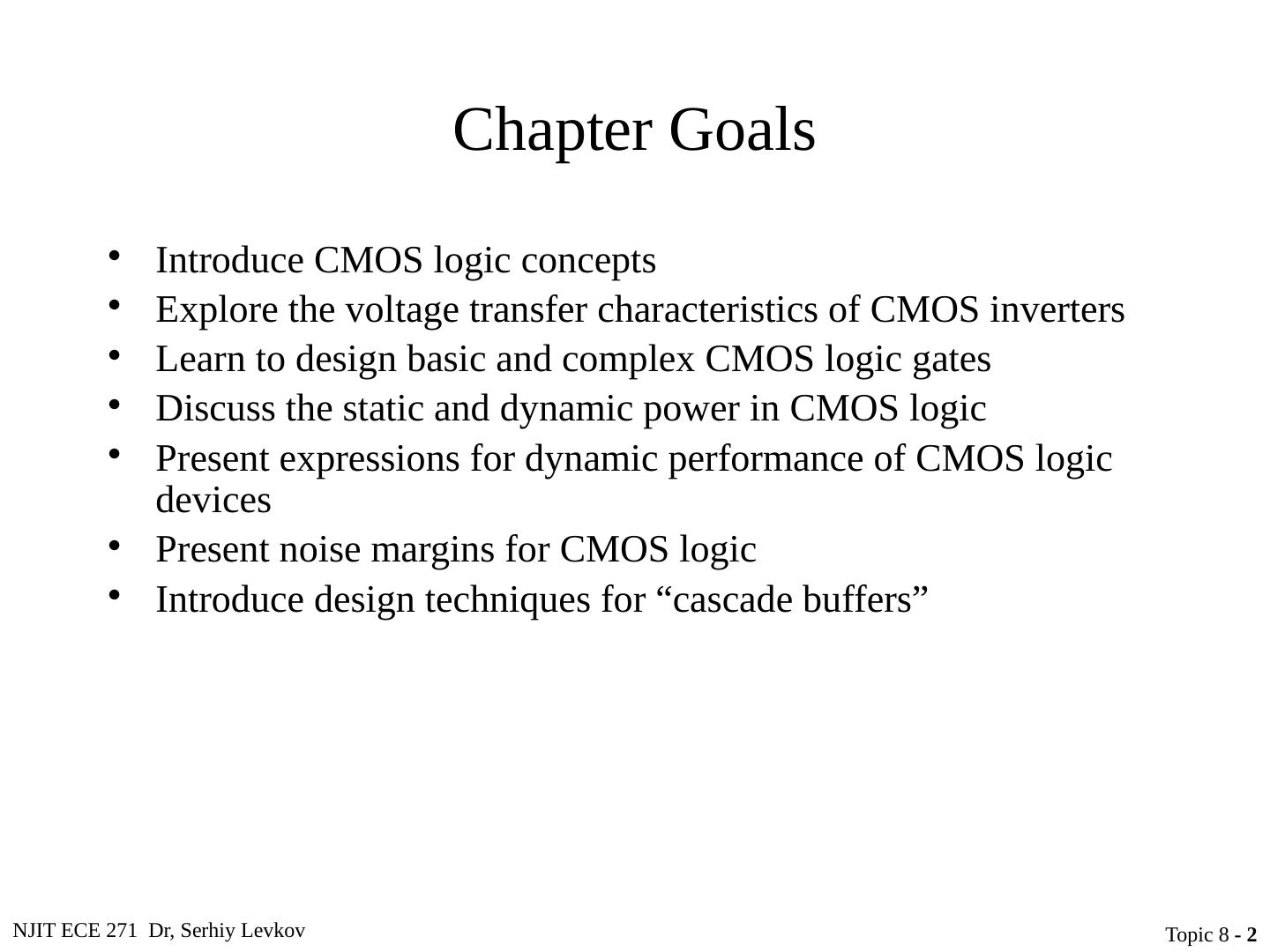 2 .NJIT ECE 271 Dr, Serhiy Levkov Topic 8 - 2 Chapter Goals Introduce CMOS logic concepts Explore the voltage transfer characteristics of CMOS inverters Learn to design basic and complex CMOS logic gates Discuss the static and dynamic power in CMOS logic Present expressions for dynamic performance of CMOS logic devices Present noise margins for CMOS logic Introduce design techniques for “cascade buffers”