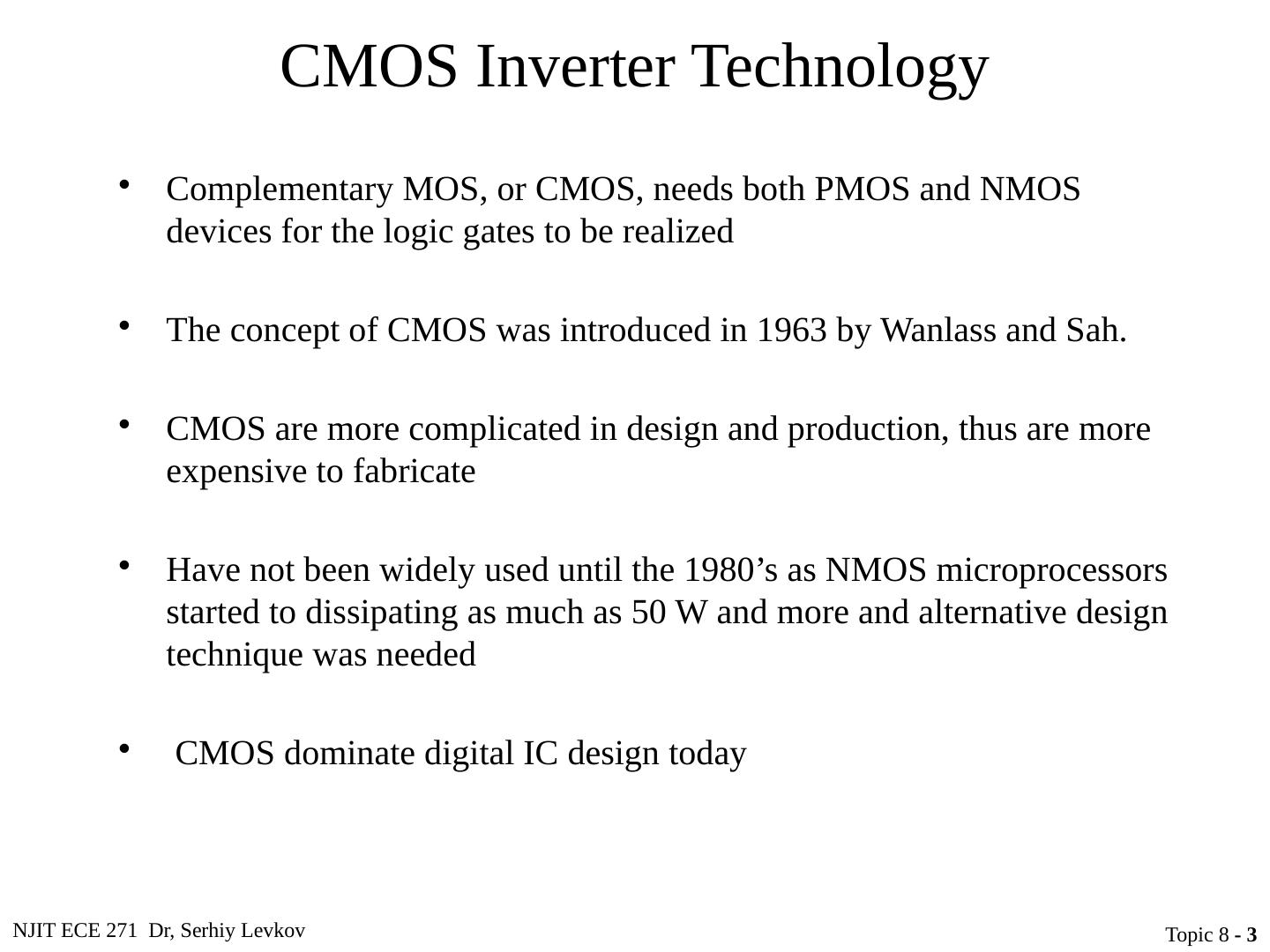 3 .NJIT ECE 271 Dr, Serhiy Levkov Topic 8 - 3 CMOS Inverter Technology Complementary MOS, or CMOS, needs both PMOS and NMOS devices for the logic gates to be realized The concept of CMOS was introduced in 1963 by Wanlass and Sah. CMOS are more complicated in design and production, thus are more expensive to fabricate Have not been widely used until the 1980’s as NMOS microprocessors started to dissipating as much as 50 W and more and alternative design technique was needed CMOS dominate digital IC design today