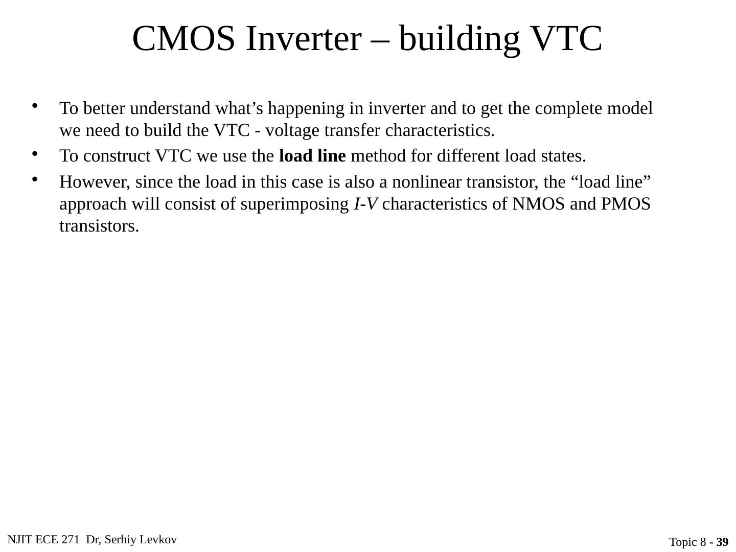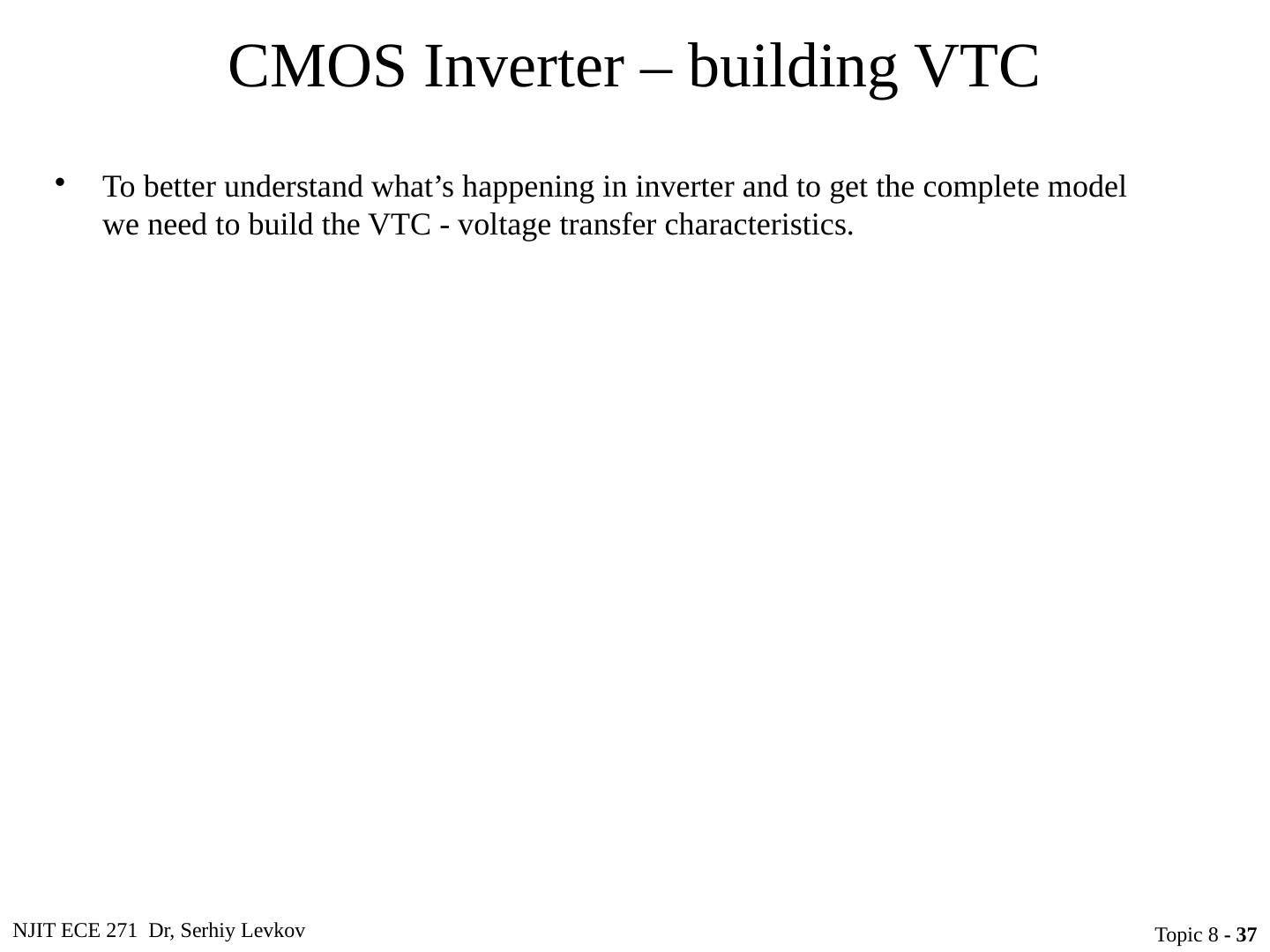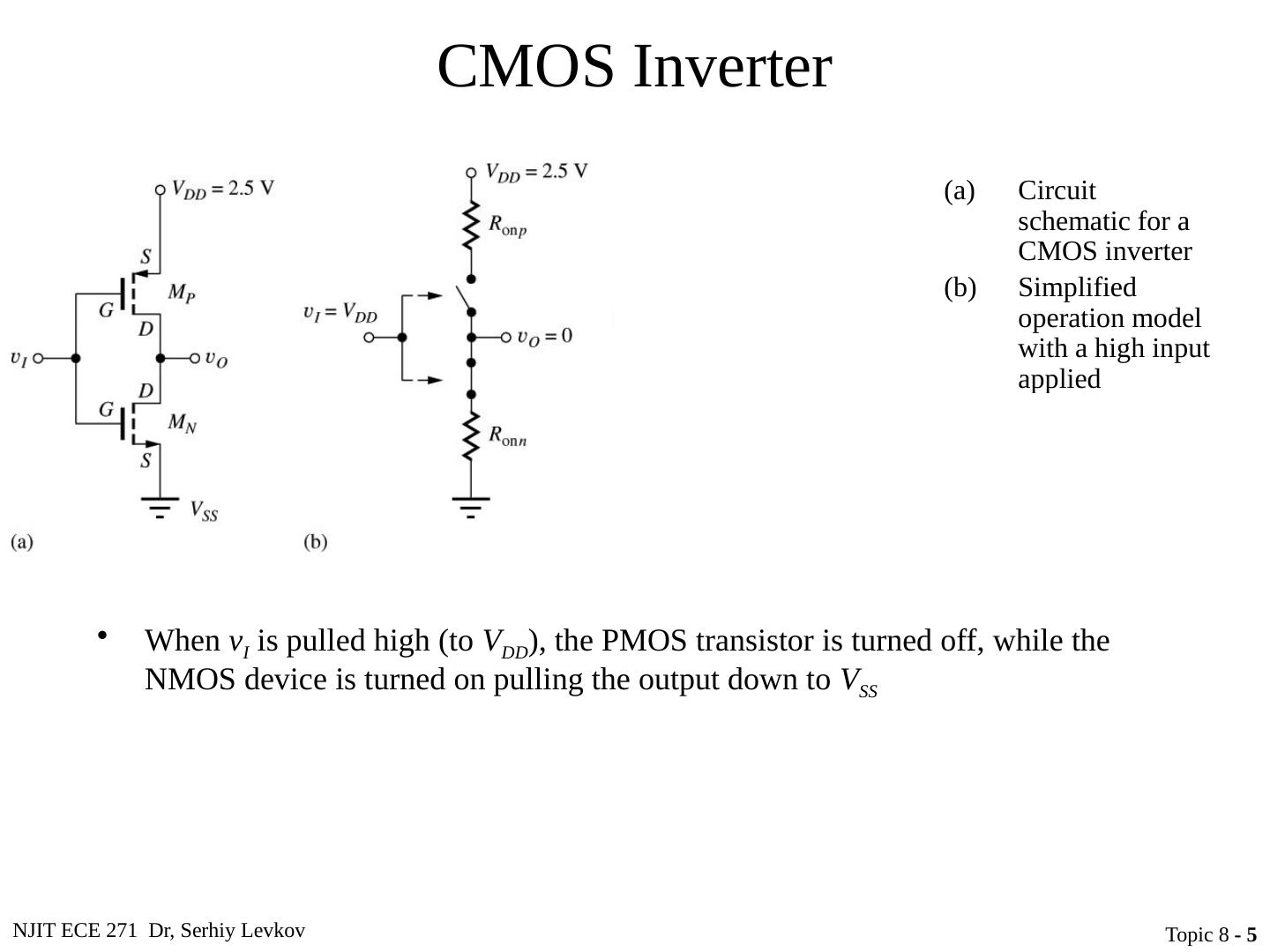 5 .NJIT ECE 271 Dr, Serhiy Levkov Topic 8 - 5 CMOS Inverter Circuit schematic for a CMOS inverter Simplified operation model with a high input applied Simplified operation model with a low input applied When v I is pulled high (to V DD ), the PMOS transistor is turned off, while the NMOS device is turned on pulling the output down to V SS