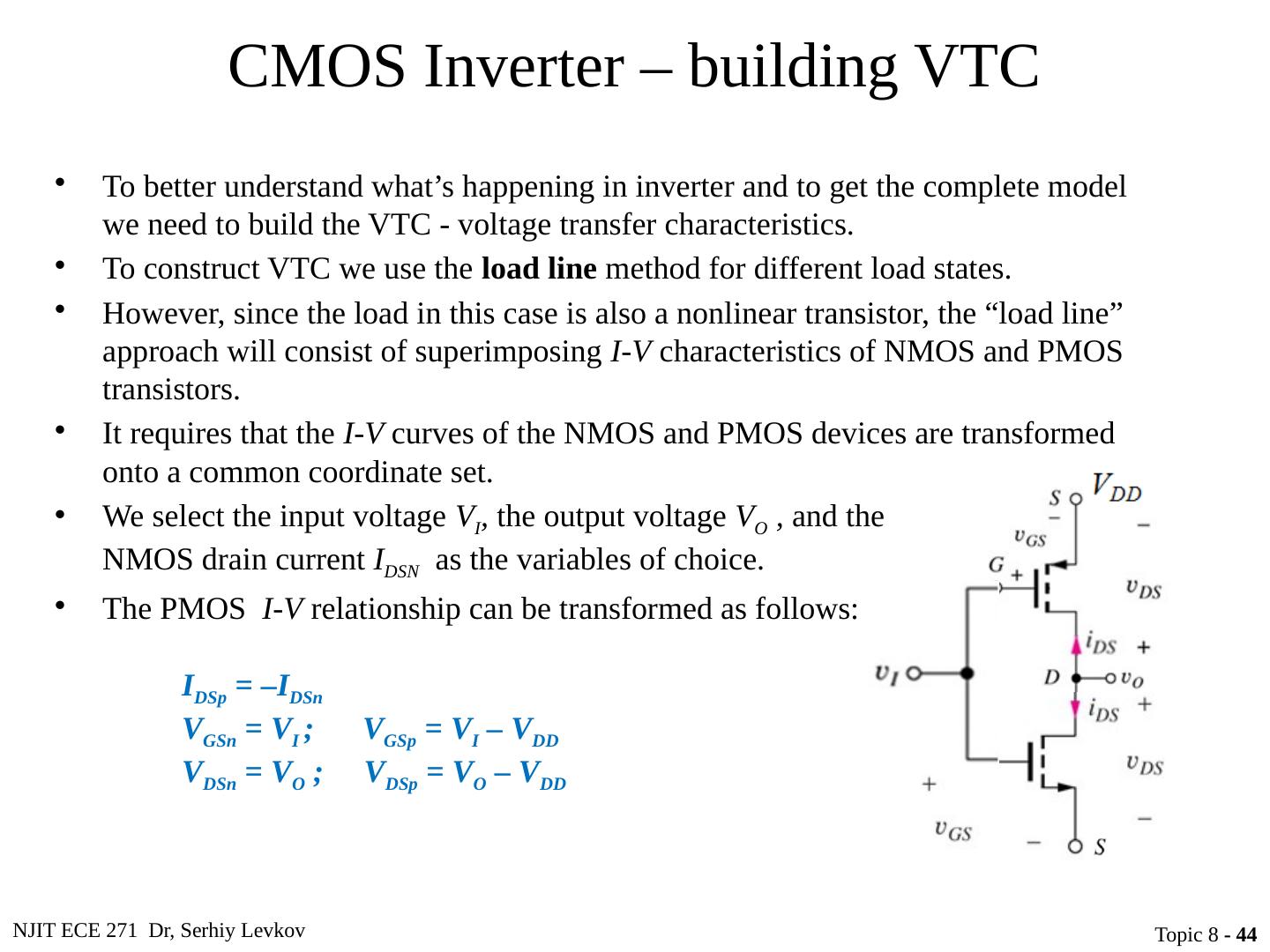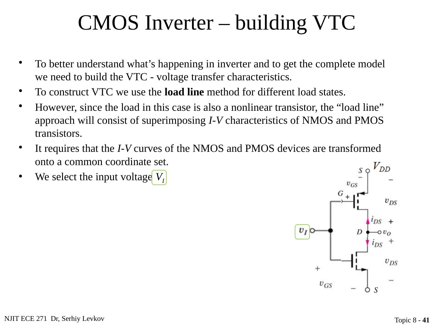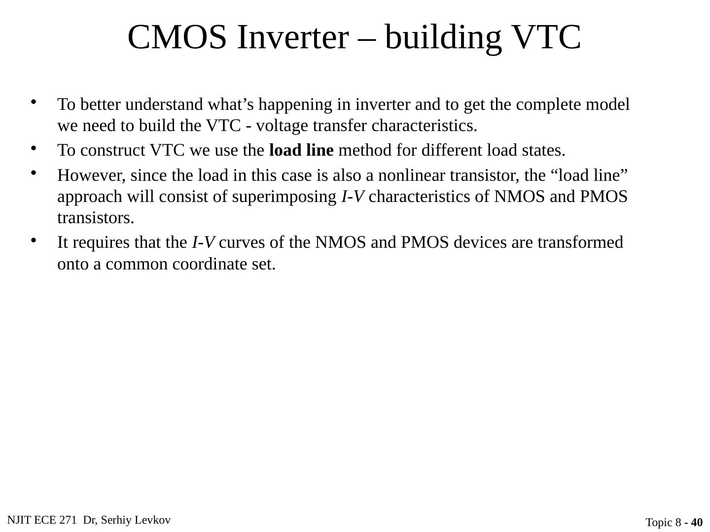 5 .NJIT ECE 271 Dr, Serhiy Levkov Topic 8 - 5 CMOS Inverter Circuit schematic for a CMOS inverter Simplified operation model with a high input applied Simplified operation model with a low input applied When v I is pulled high (to V DD ), the PMOS transistor is turned off, while the NMOS device is turned on pulling the output down to V SS