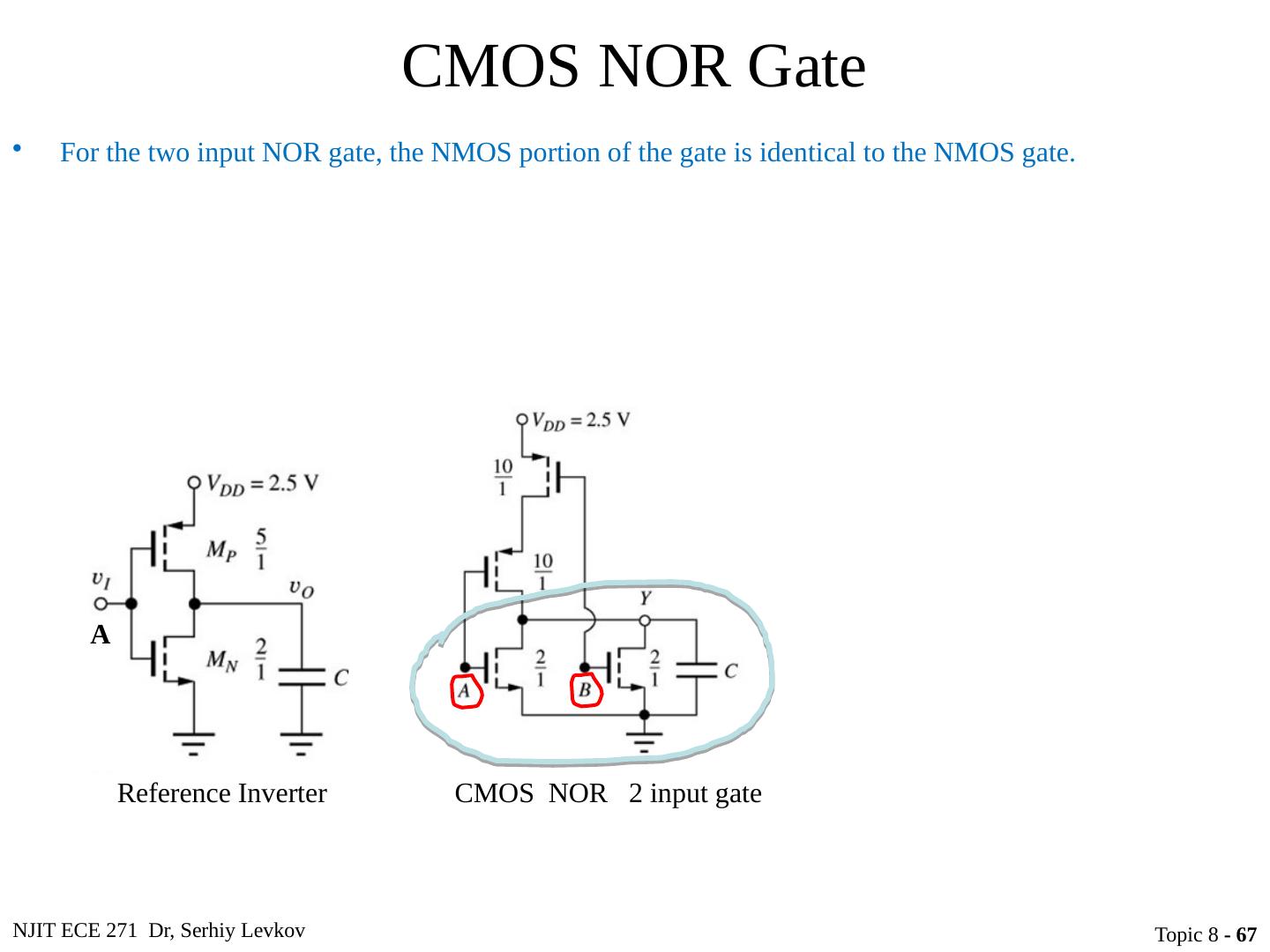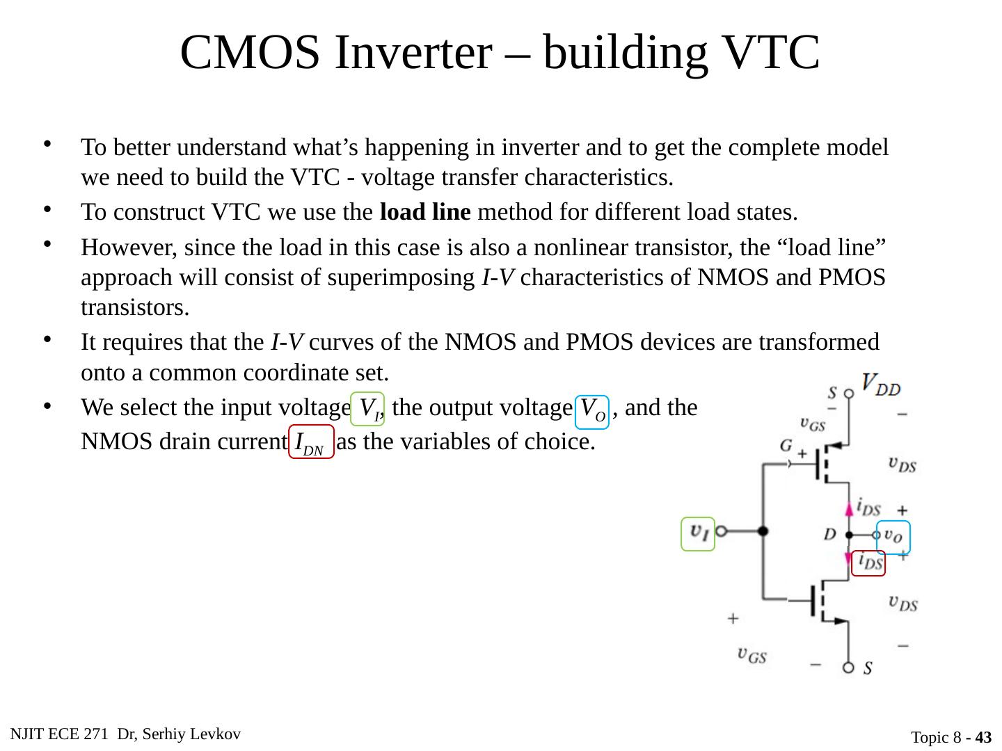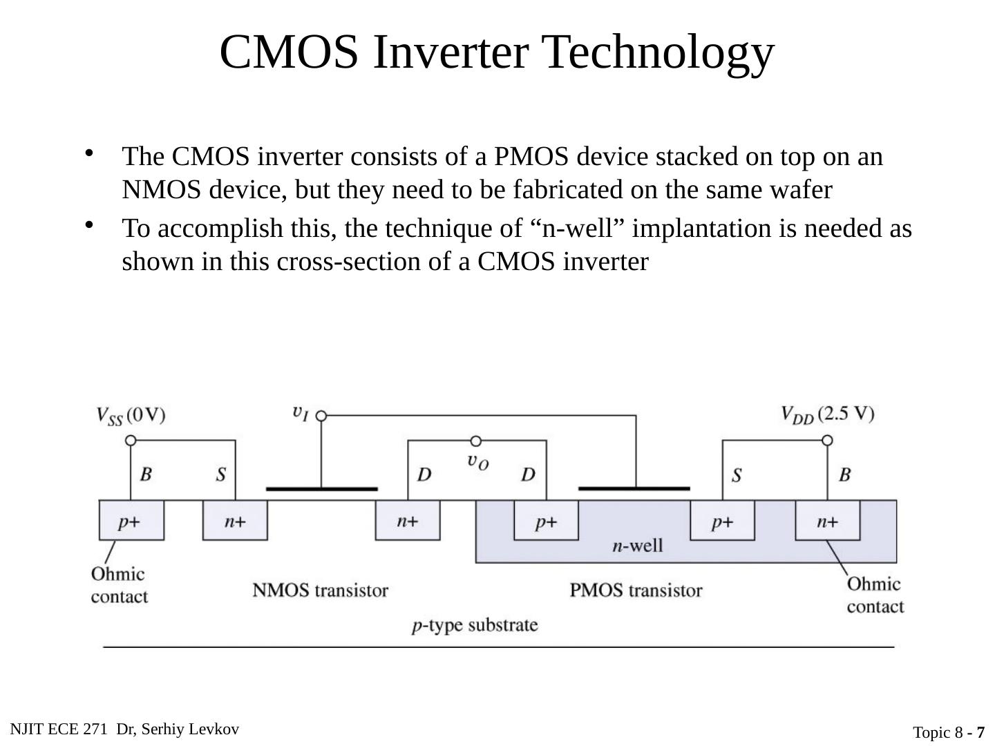 7 .NJIT ECE 271 Dr, Serhiy Levkov Topic 8 - 7 CMOS Inverter Technology The CMOS inverter consists of a PMOS device stacked on top on an NMOS device, but they need to be fabricated on the same wafer To accomplish this, the technique of “n-well” implantation is needed as shown in this cross-section of a CMOS inverter